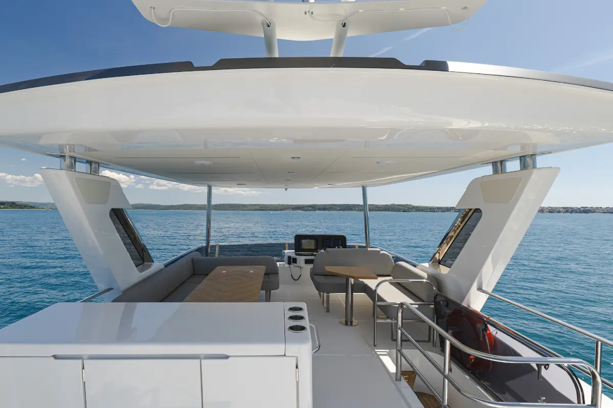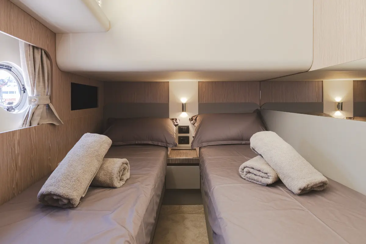 Die großzügigen Kabinen laden zu entspannenden Nächten ein, während die elegante Flybridge der perfekte Ort für Ihren morgendlichen Kaffee mit Blick auf das türkisfarbene Wasser ist. Stellen Sie sich vor, wie Sie abends unter einem sternenklaren Himmel entspannen – das sanfte Schaukeln des Wassers und die komfortablen Loungemöbel schaffen eine Atmosphäre der Ruhe und des Wohlbefindens.