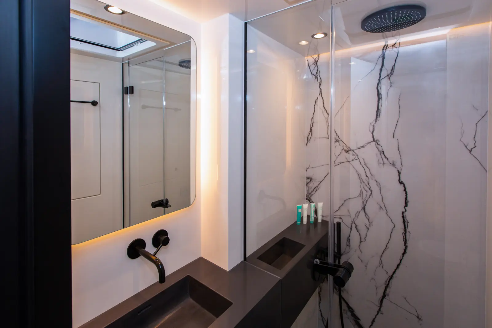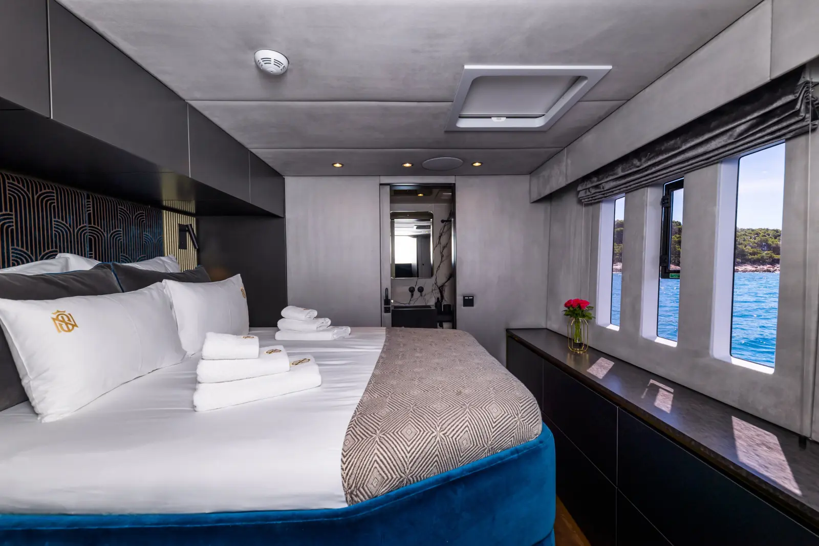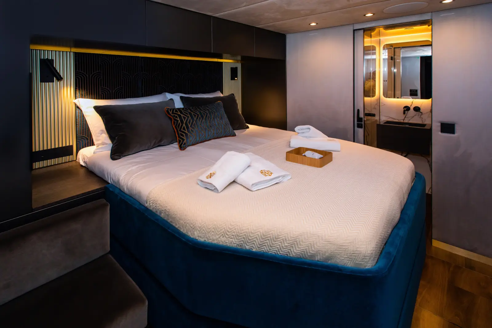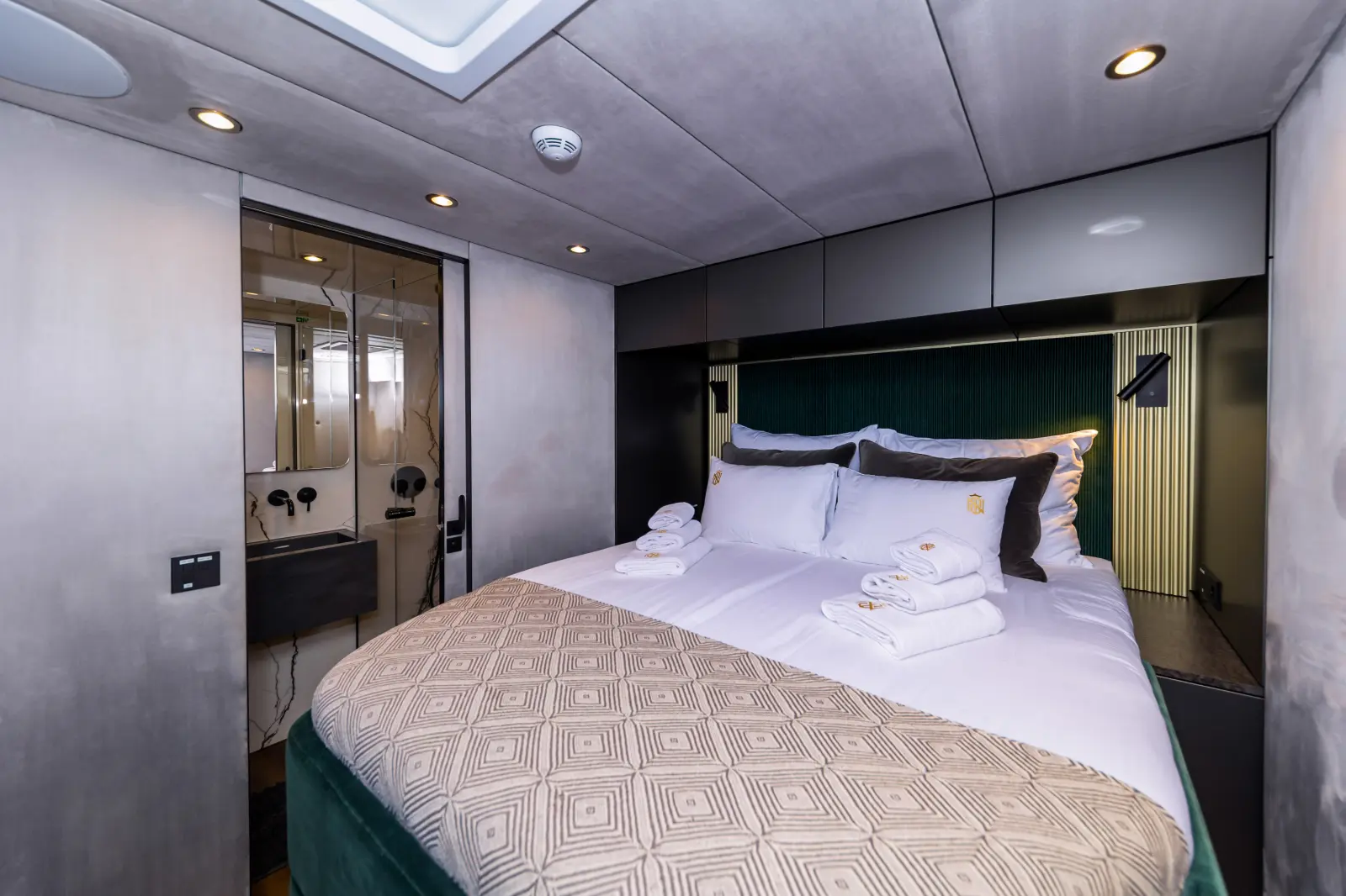 - Vier stilvolle Doppelkabinen: An Bord finden bis zu 8 Gäste in vier luxuriösen Doppelkabinen mit eigenem Bad Platz. Jede Kabine ist eine private Oase der Ruhe, geschmackvoll eingerichtet und mit allem Komfort ausgestattet, der für einen erholsamen Schlaf sorgt.
