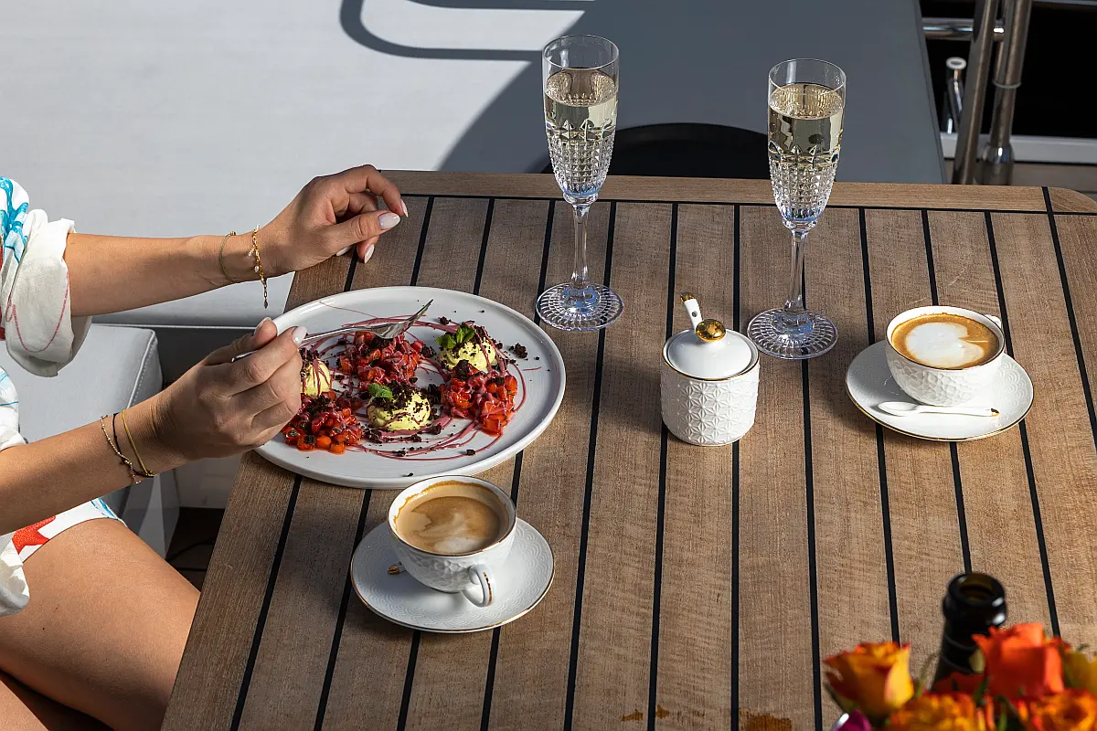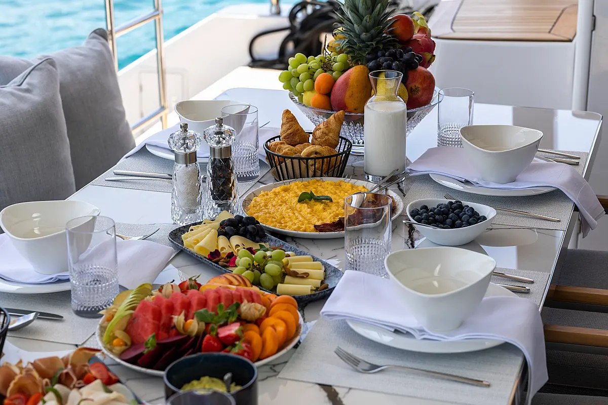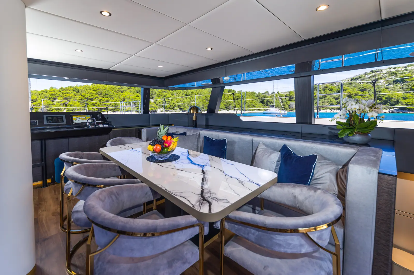 - Weitläufige Außenbereiche: Die Sunreff 60 – Mr. Si“ besticht durch ihre großzügigen Außenbereiche. Das Vordeck lädt mit seinen bequemen Liegeflächen zum Entspannen ein, während die Flybridge ein beeindruckendes Sonnendeck mit Sitzgelegenheiten und oft auch einer Bar bietet – der perfekte Ort für Sundowner mit unvergleichlicher Aussicht.