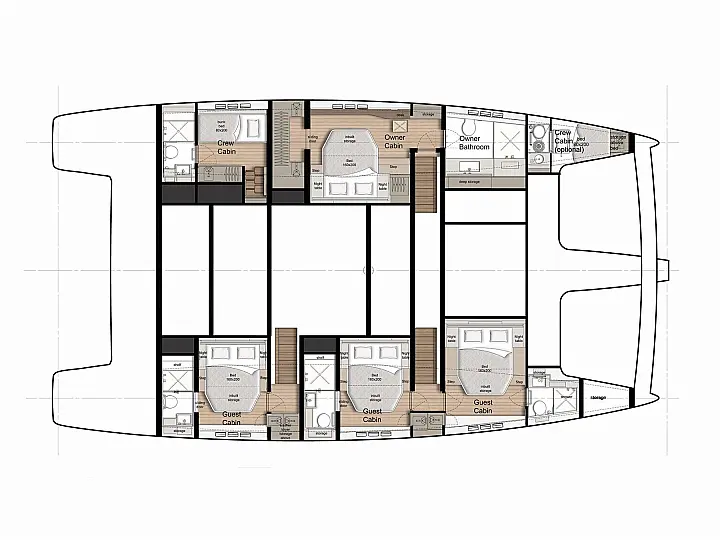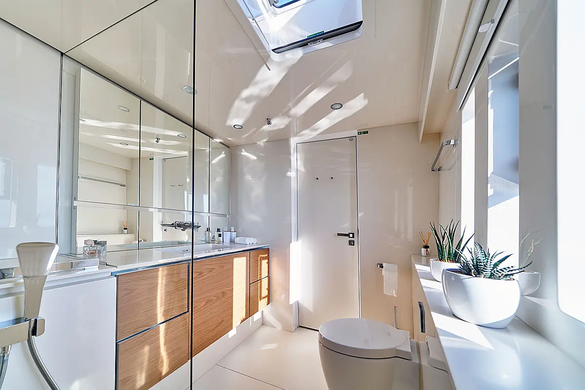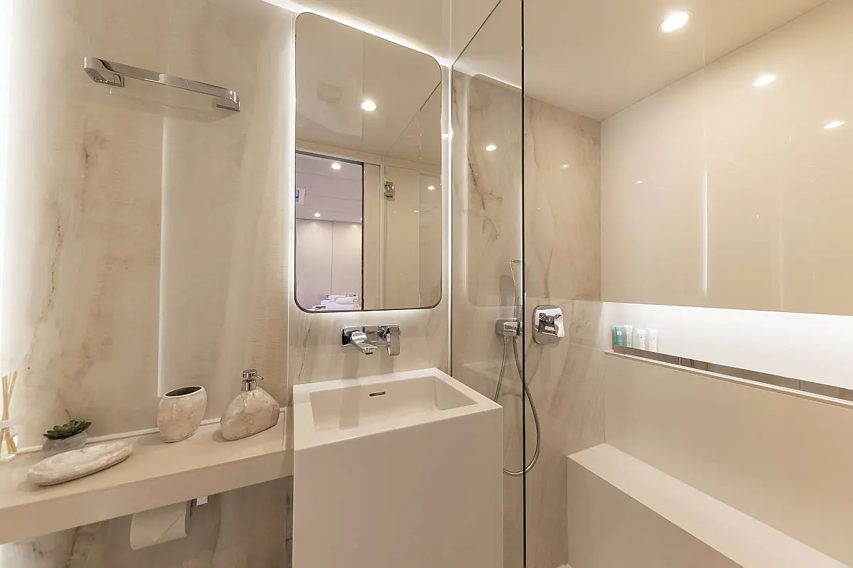 - Elegant Wohnen: Die Kabinen sind luxuriös ausgestattet und bieten Platz für bis zu 12 Gäste (typischerweise 6 Doppelkabinen), jeder mit eigenem, elegantem Bad. Die Innenausstattung spiegelt zeitgenössischen Luxus wider und sorgt für eine behagliche Atmosphäre.
