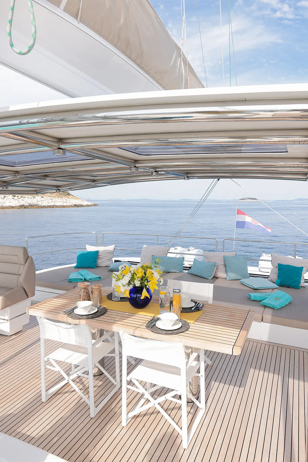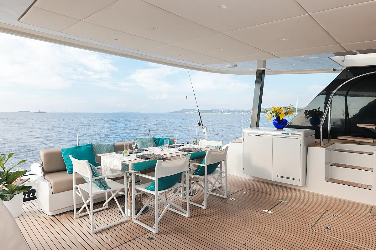 - Spektakuläre Flybridge: Ein Highlight ist die riesige Flybridge, die mit Sonnenliegen, Sitzgruppen und einer optionalen Bar ausgestattet ist – Ihr privater Aussichtspunkt für Sundowner über den dalmatinischen Inseln.
