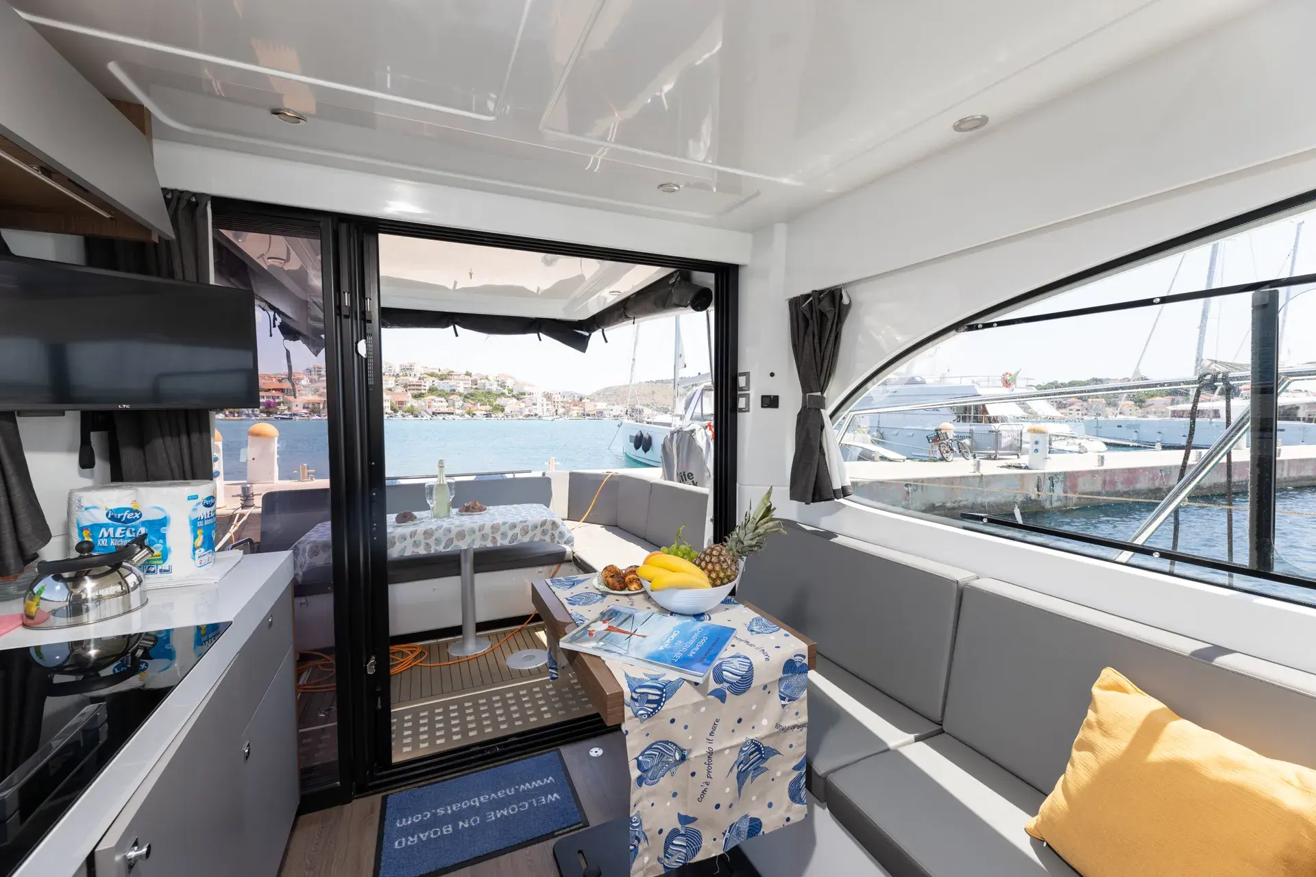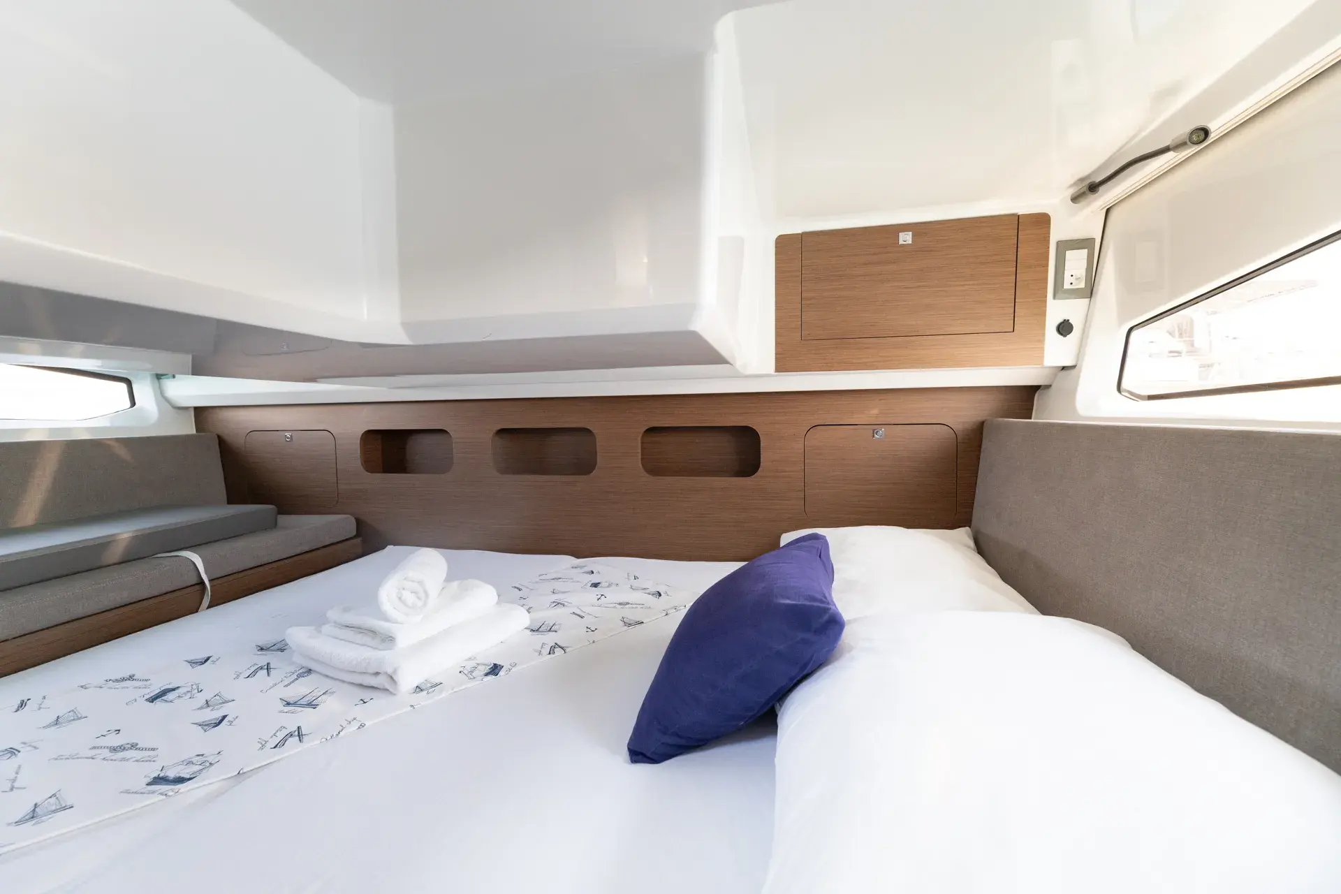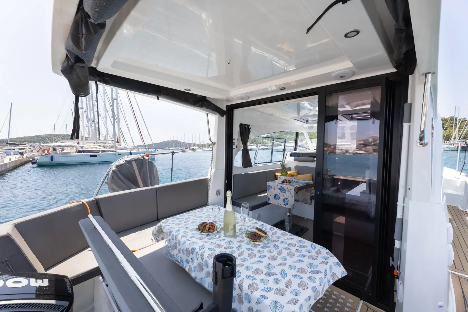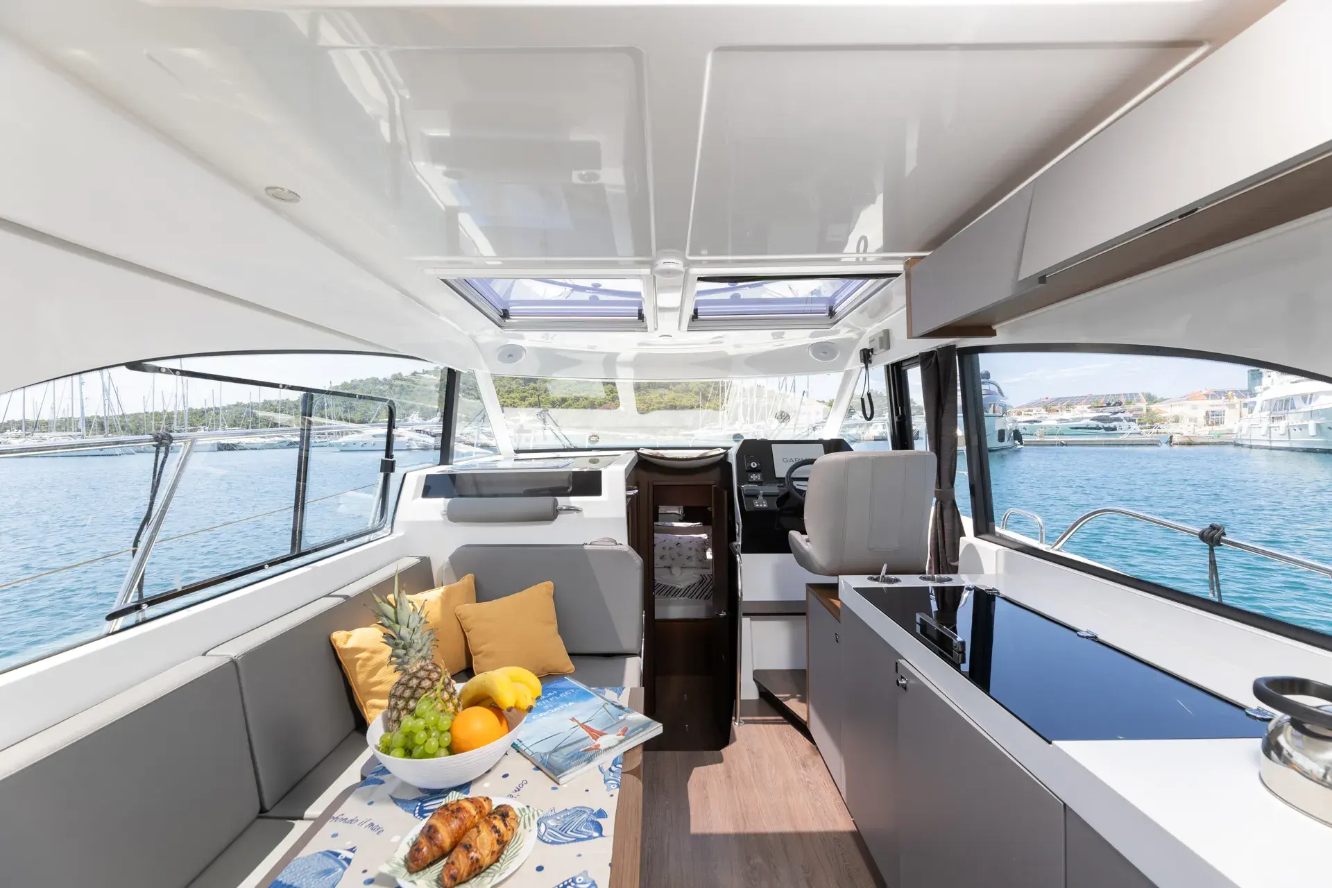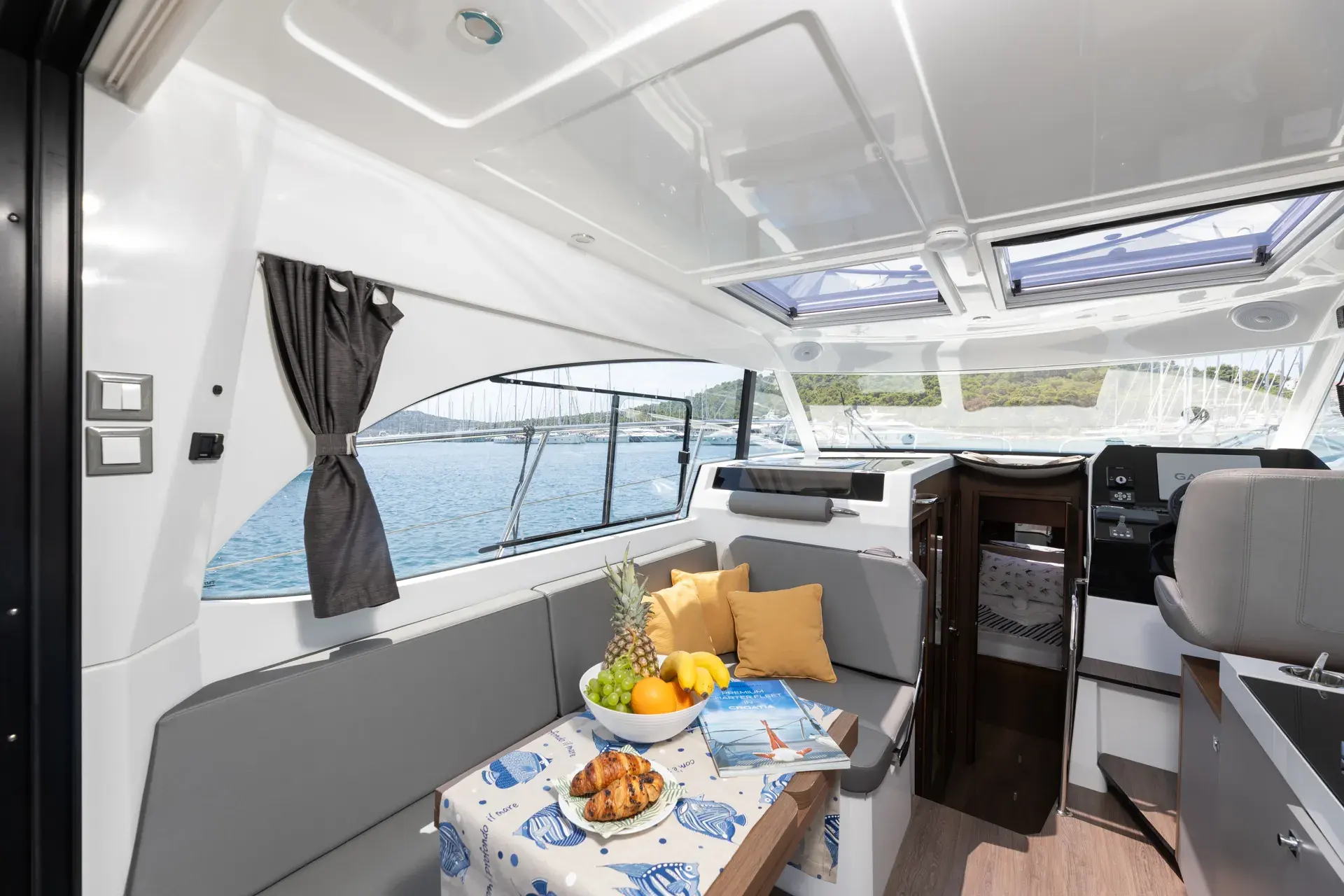 An Bord genießt du ein modernes, elegantes Interieur mit gemütlichen Kabinen, hellem Salon und durchdachtem Layout – perfekt zum gemeinsamen Kochen, Spielen und Entspannen nach einem Tag in den Buchten. Die leistungsstarke Doppelmotorisierung von Mercury mit 2 x 300 PS sorgt für sicheres und zügige Törns zwischen den Inseln.