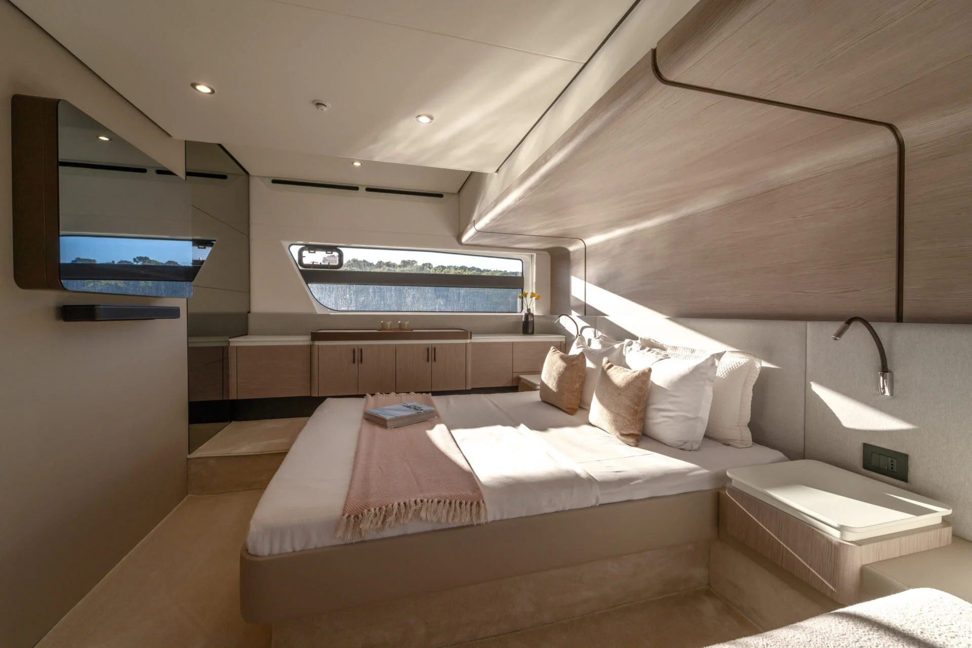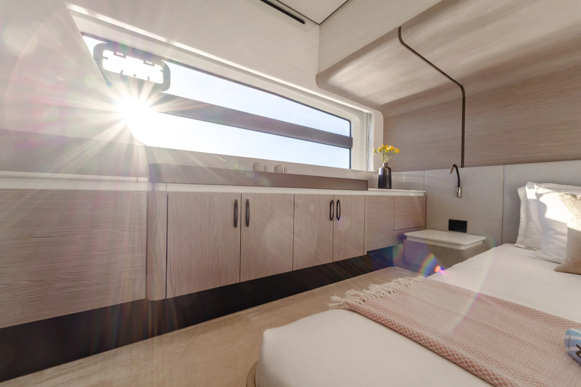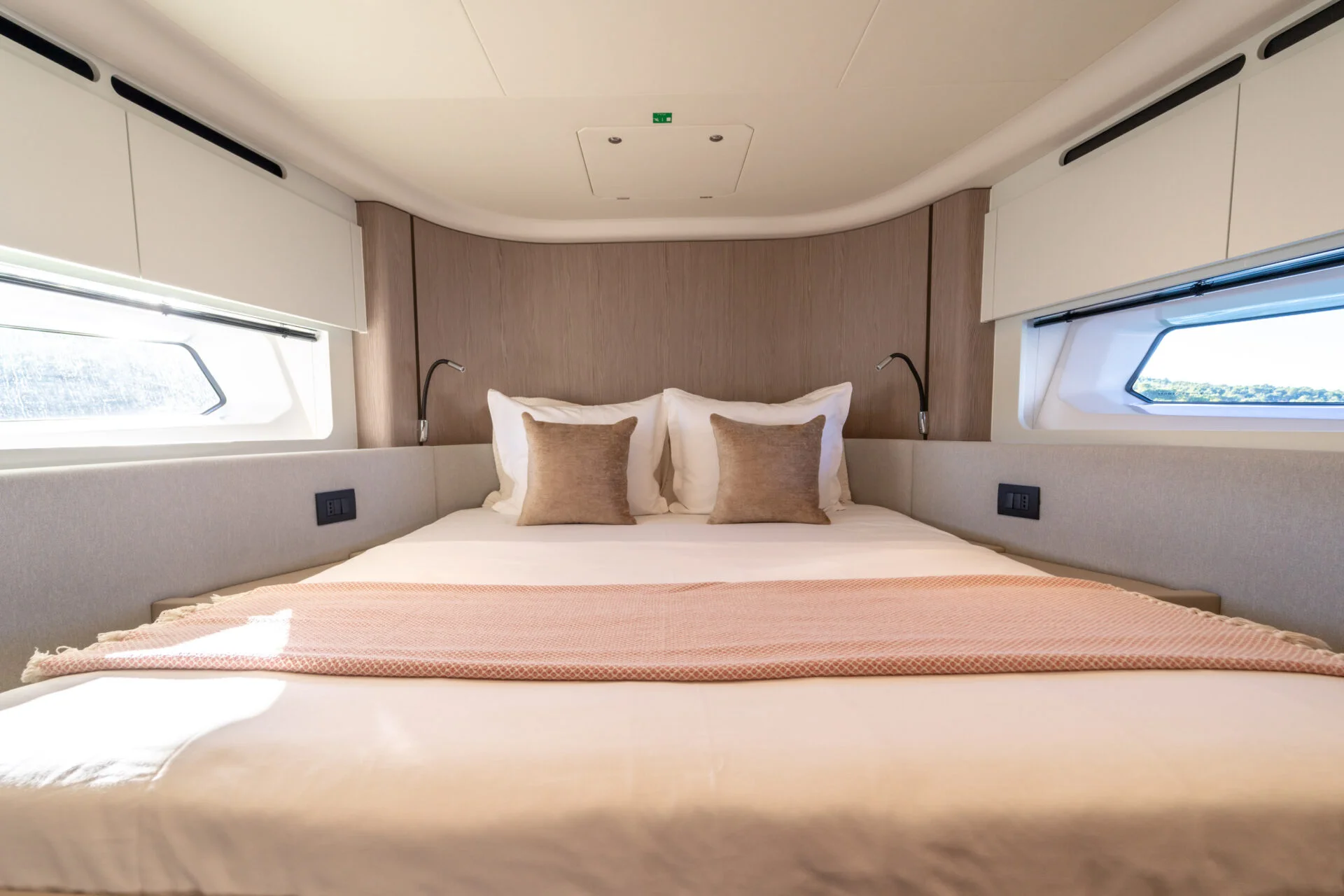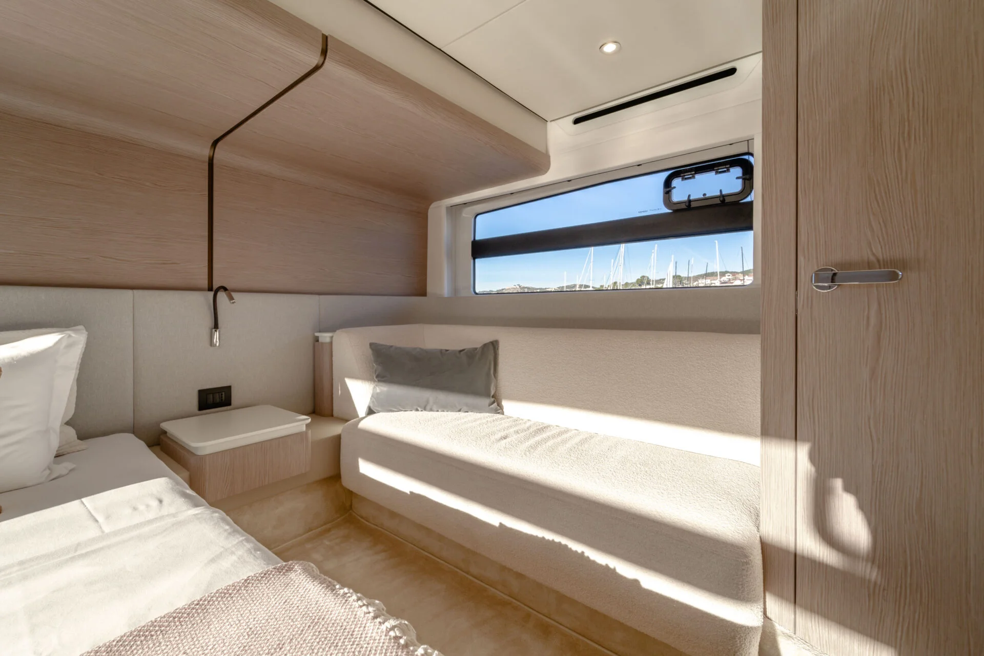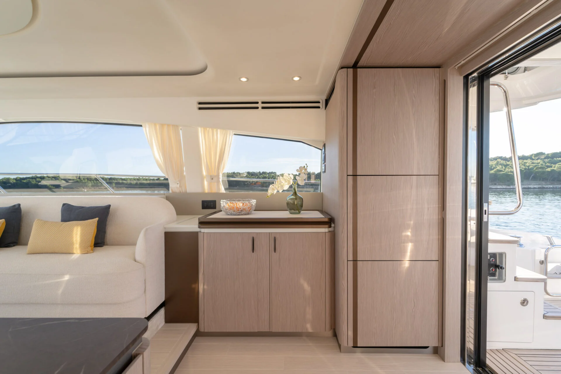 • Luxuriöses Interieur: Der Salon ist stilvoll eingerichtet und bietet dank großer Fensterfronten viel natürliches Licht und eine hervorragende Verbindung zum Meer. Die Yacht verfügt über 3 Kabinen mit hochwertiger Ausstattung, die auch auf längeren Törns höchsten Komfort garantieren.