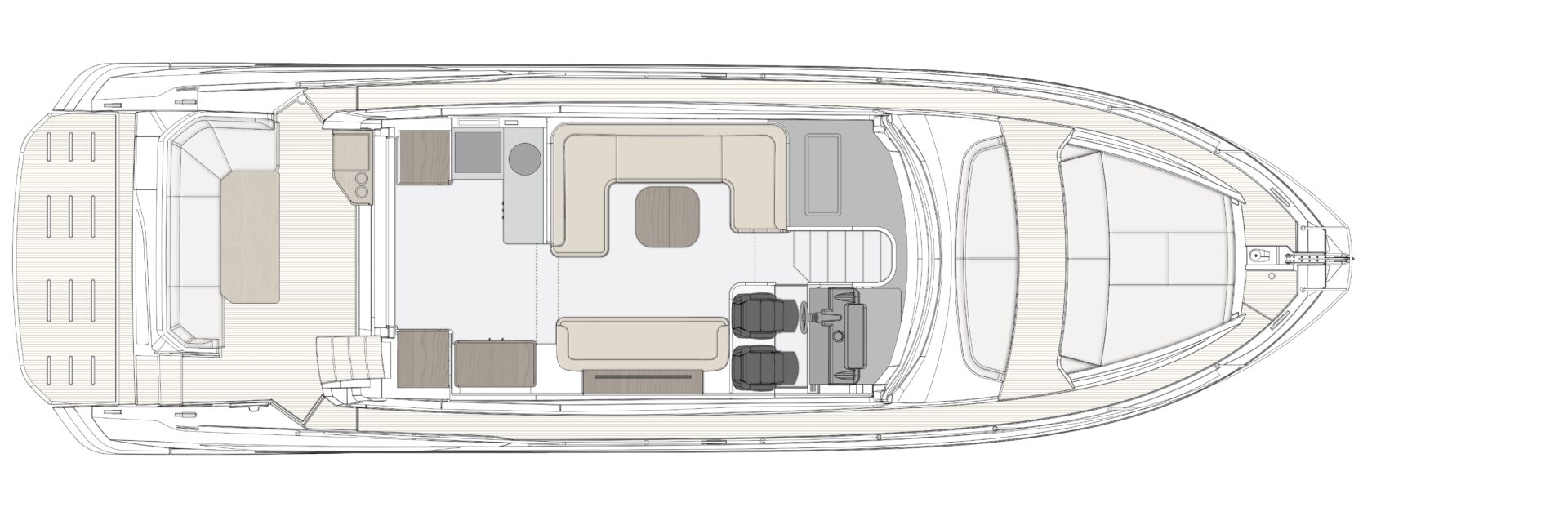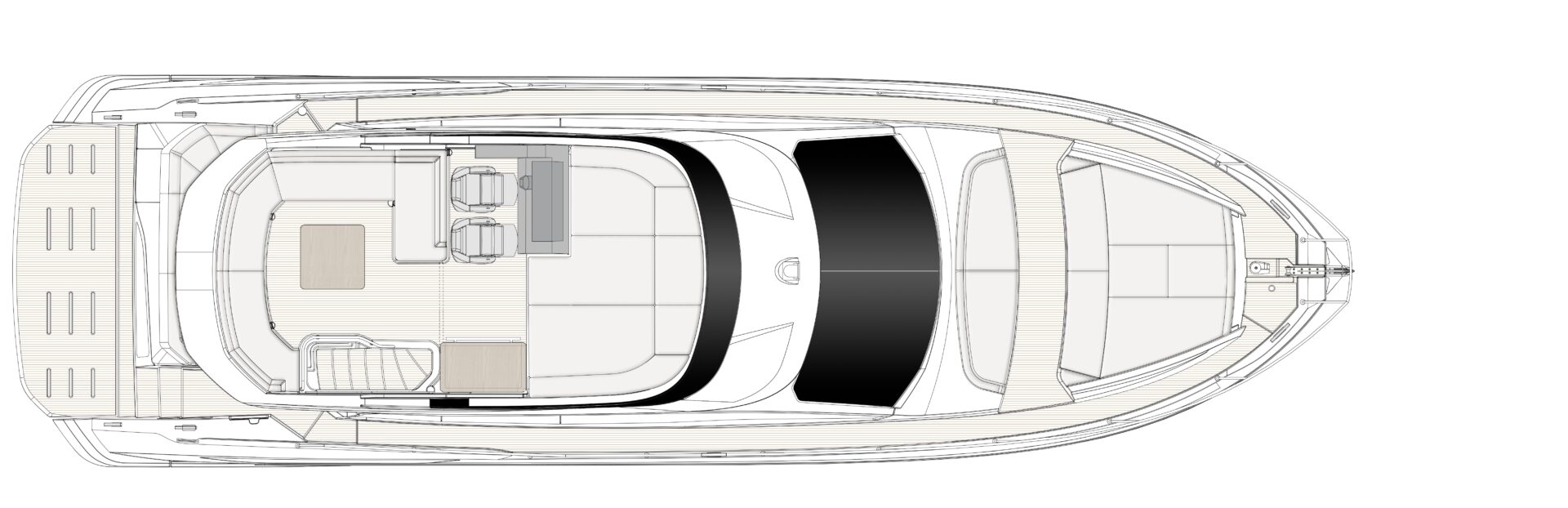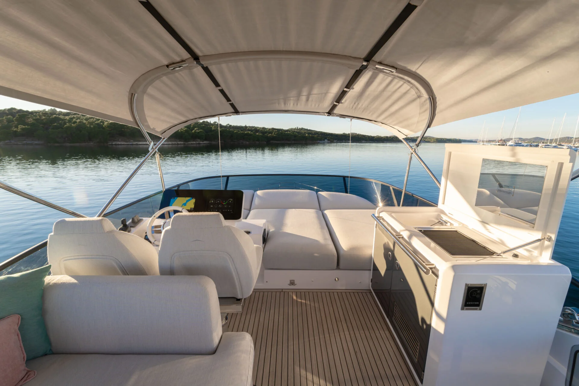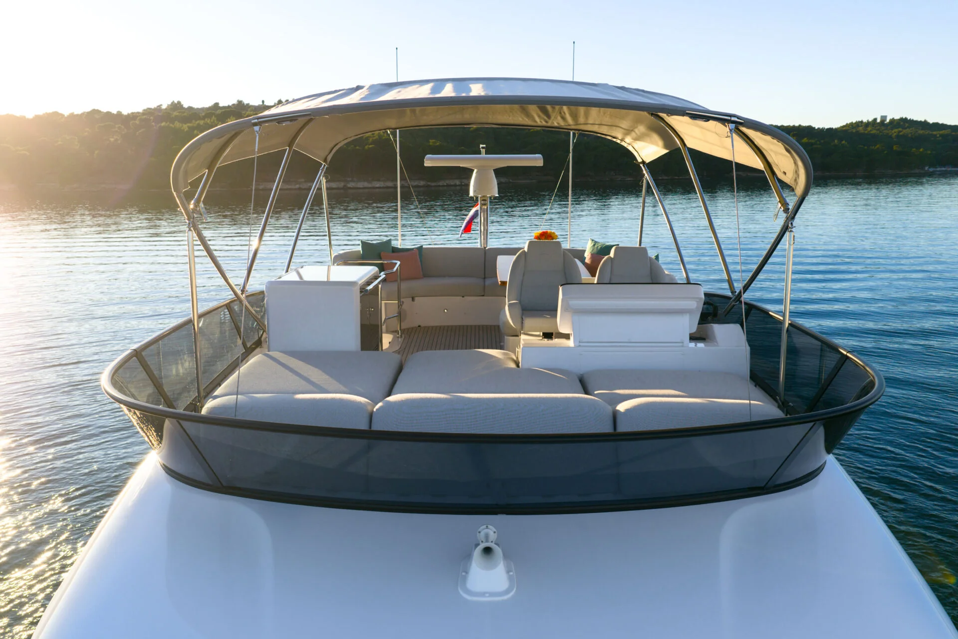 • Flybridge: Das Herzstück dieses Modells ist die weitläufige Flybridge. Hier genießen Sie einen erhöhten Steuerstand, eine komfortable Sitzgruppe und großzügige Sonnenliegen – der ideale Ort, um die spektakuläre Aussicht auf die vorgelagerten Inseln zu genießen.