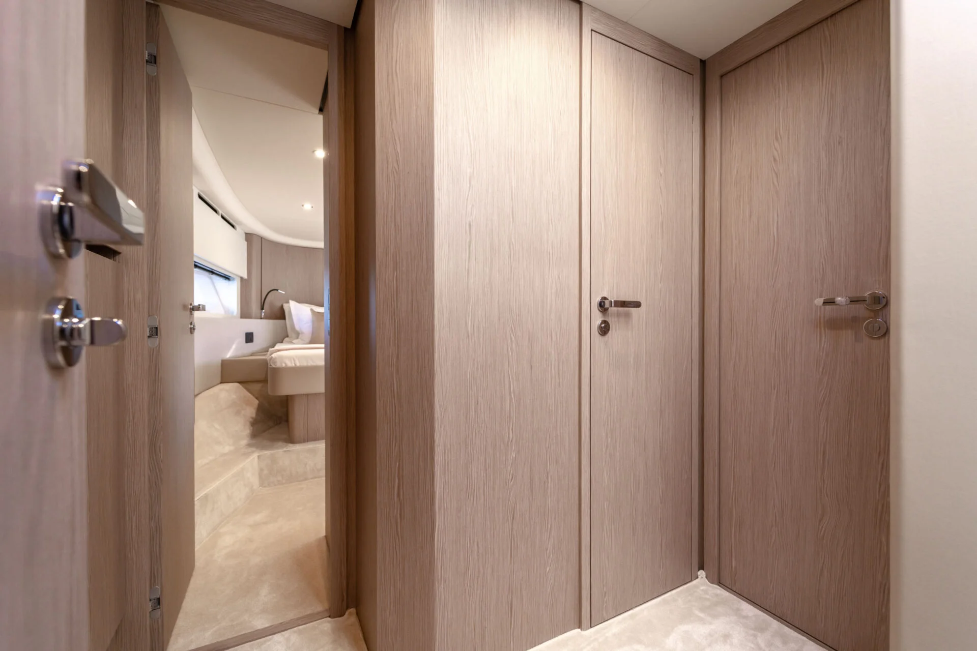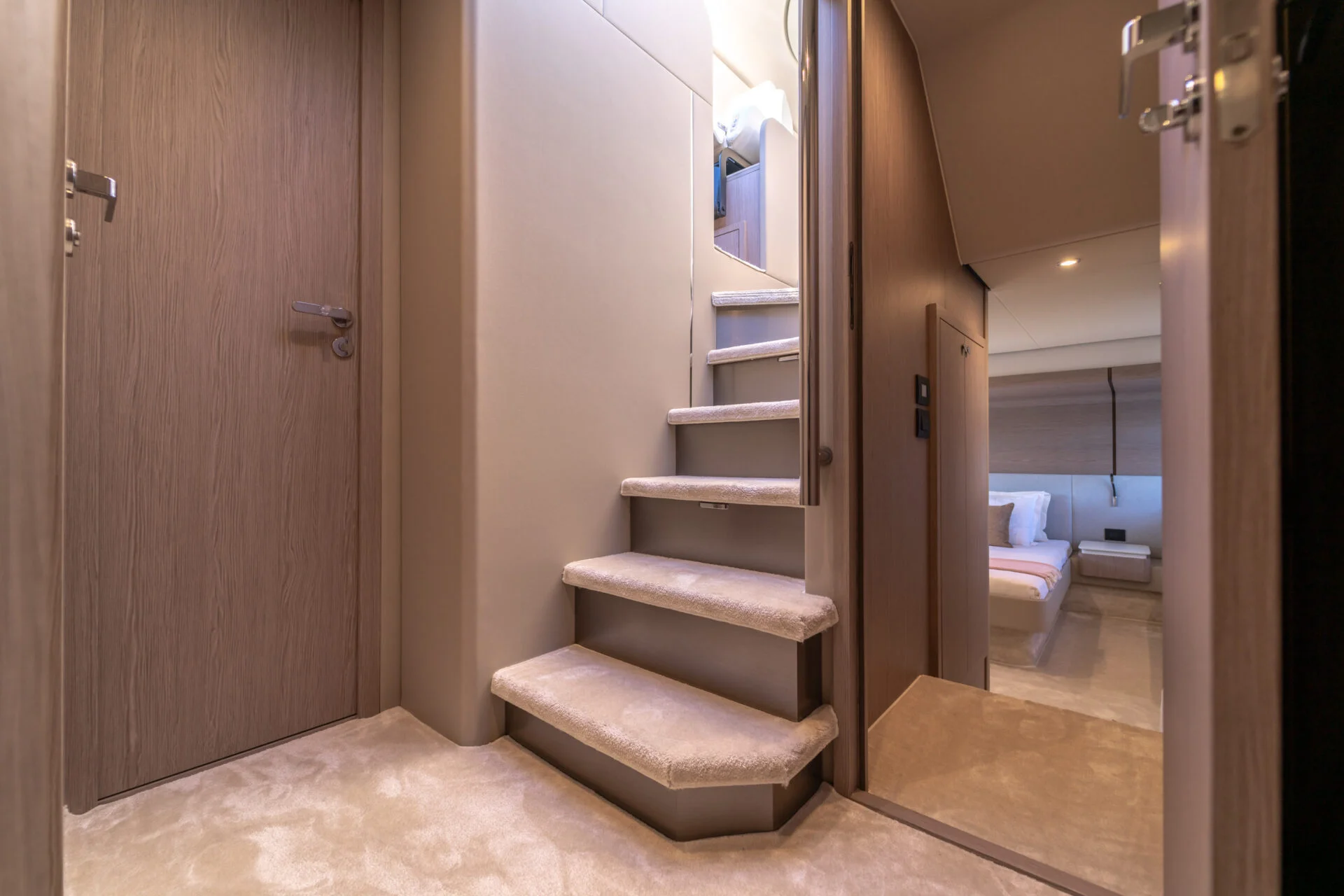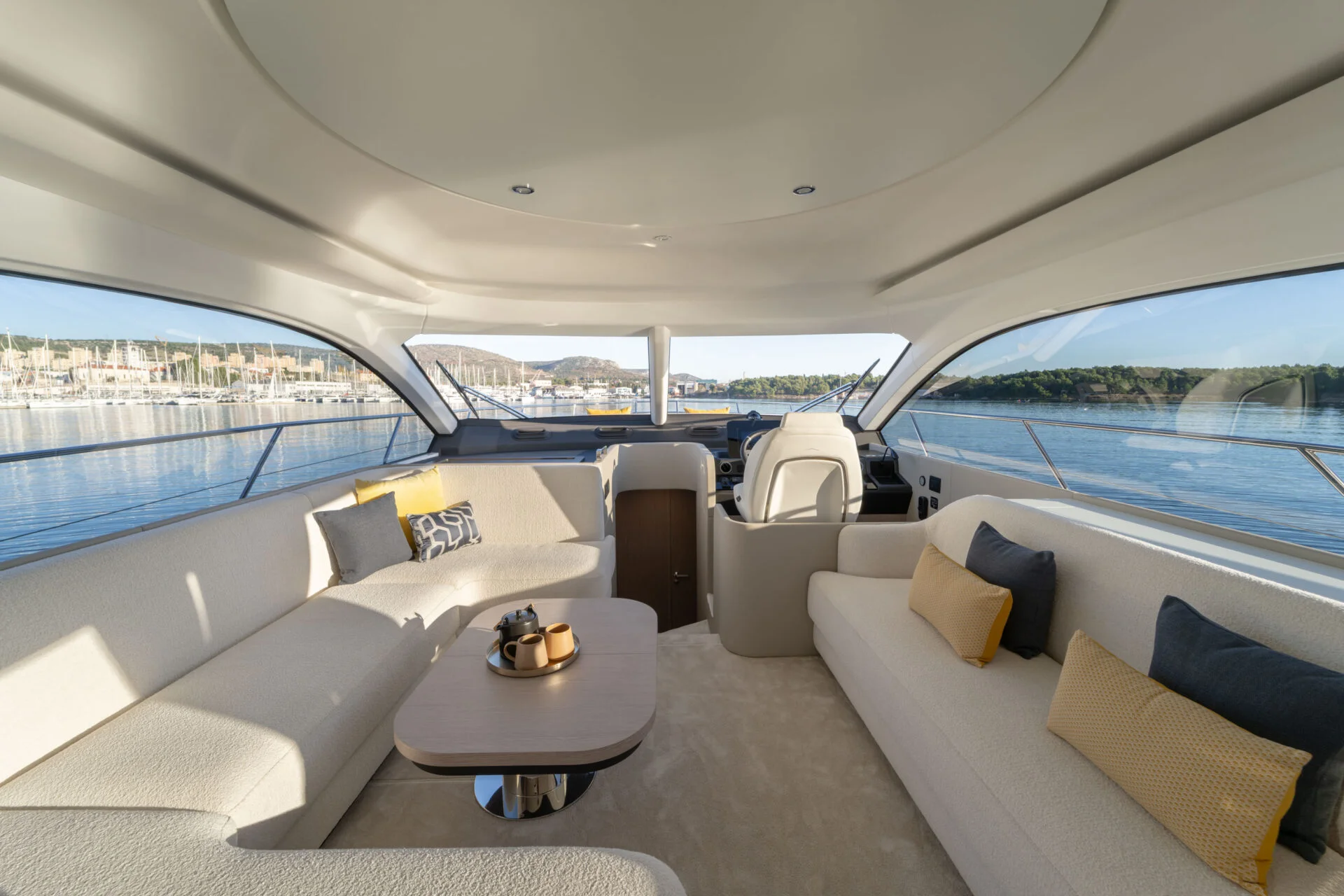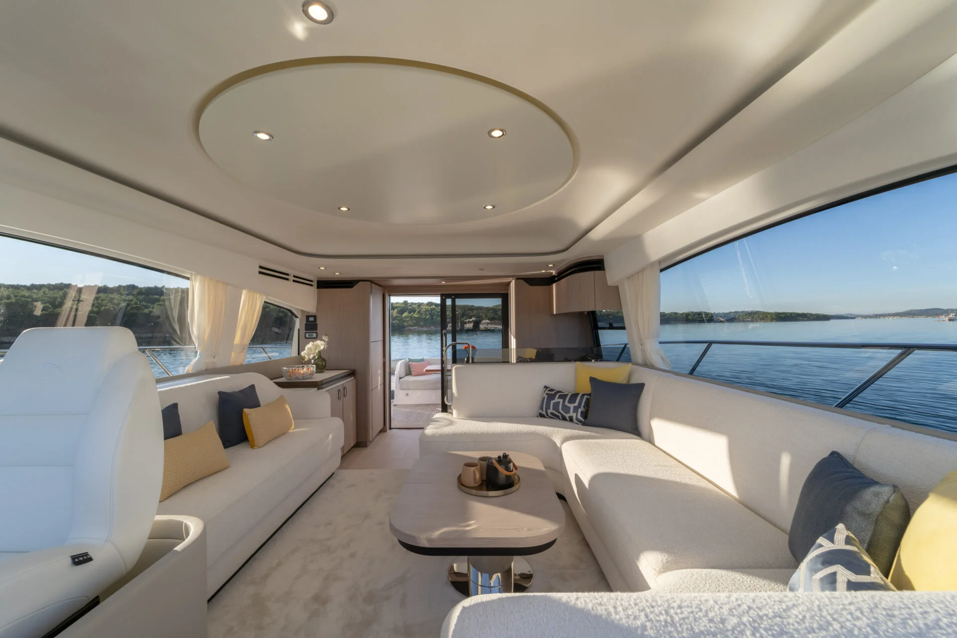 • Flybridge: Das Herzstück dieses Modells ist die weitläufige Flybridge. Hier genießen Sie einen erhöhten Steuerstand, eine komfortable Sitzgruppe und großzügige Sonnenliegen – der ideale Ort, um die spektakuläre Aussicht auf die vorgelagerten Inseln zu genießen.