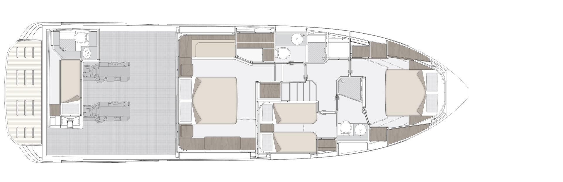 • Außenbereiche: Sowohl das Achterdeck als auch die Badeplattform bieten bequeme Bereiche zum Entspannen, Essen oder für Wassersportaktivitäten.