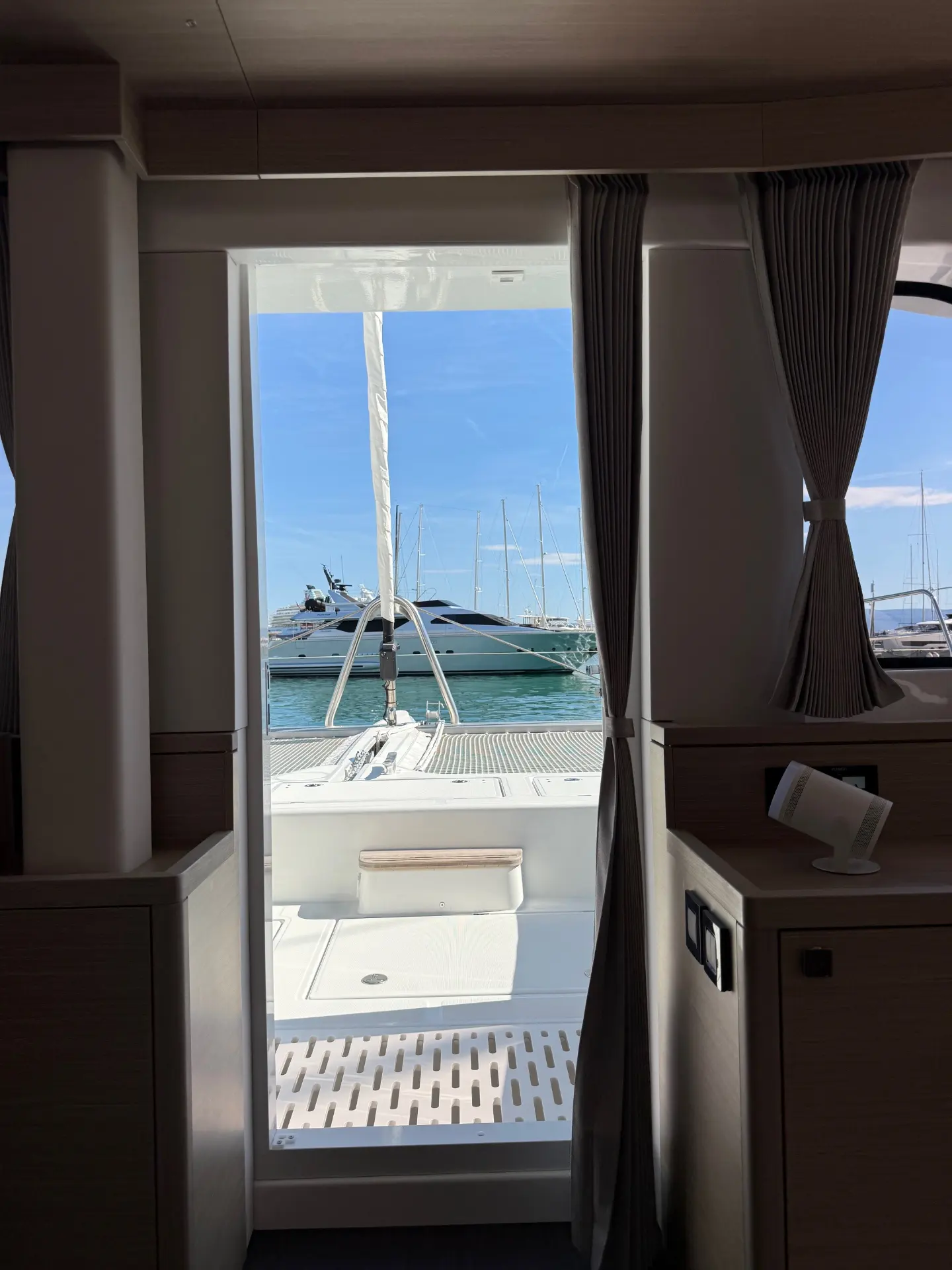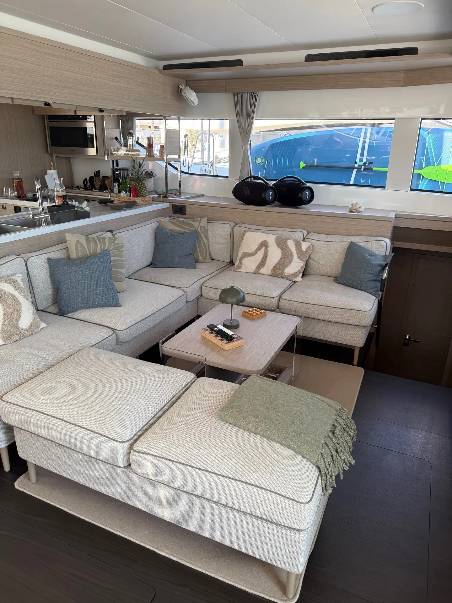 - Salon mit Panoramablick: Der großzügige Salon ist das Herzstück des Bootes und bietet durch umlaufende Fenster einen atemberaubenden 360-Grad-Blick auf die kroatische Küste und die vorgelagerten Inseln. Hier finden Sie bequeme Sitzgelegenheiten und einen eleganten Essbereich.