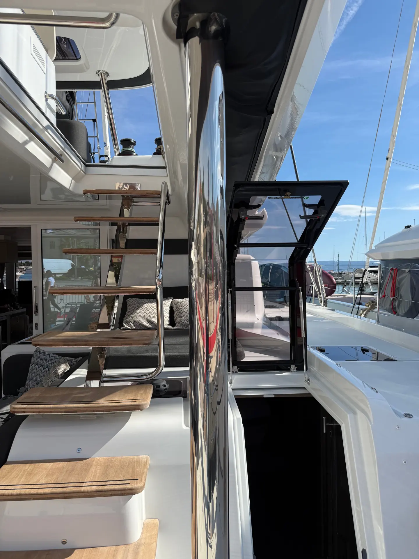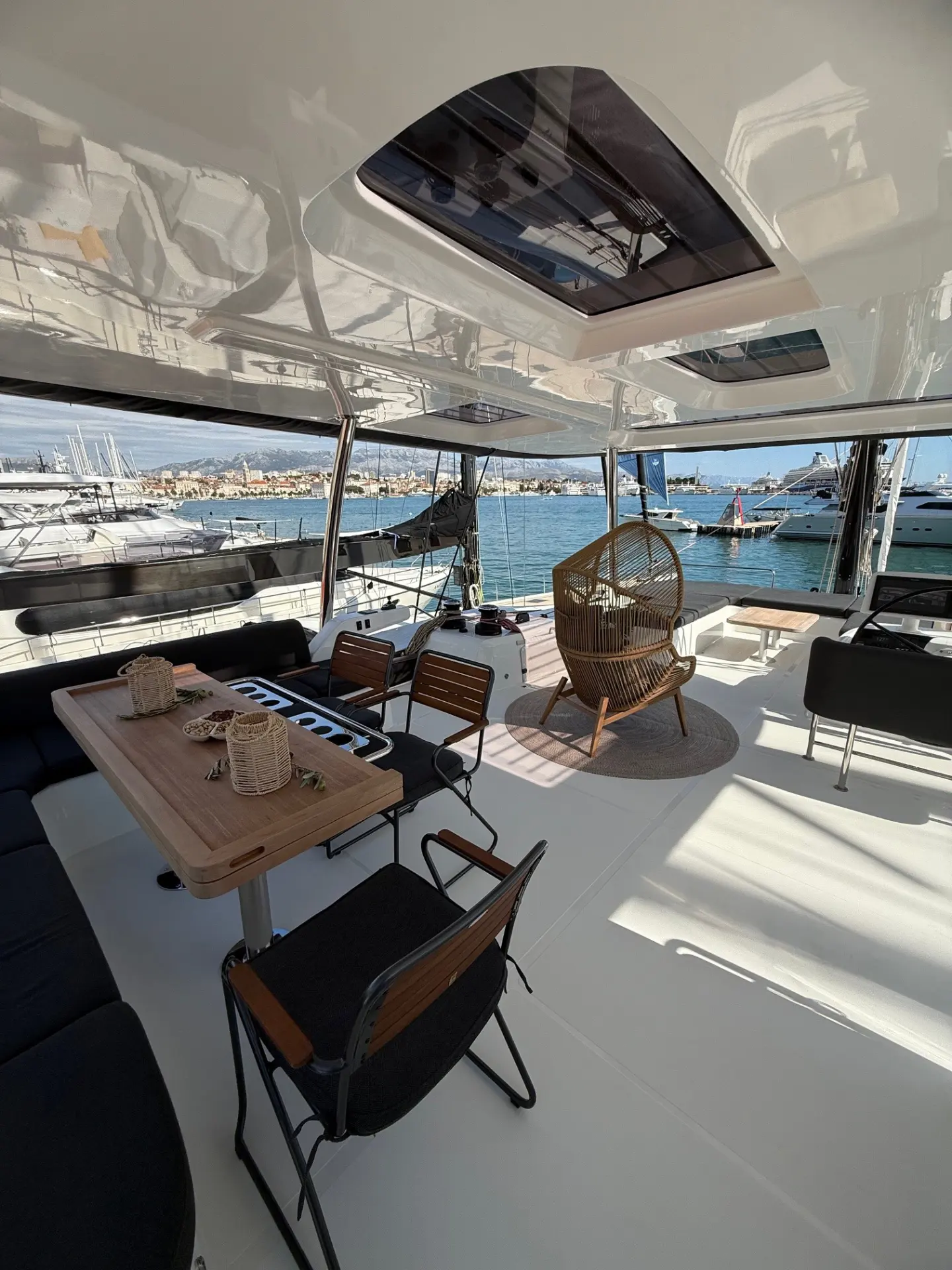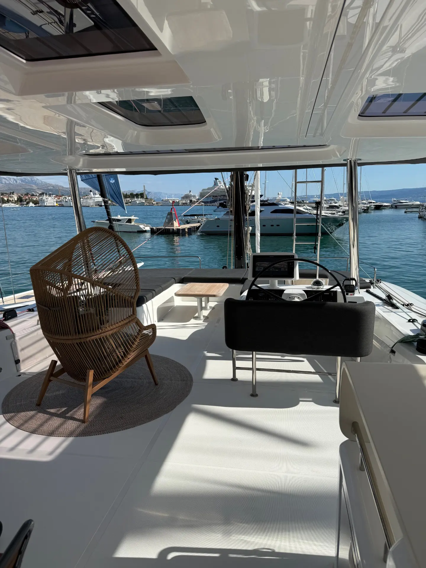- Außenbereiche: Genießen Sie das Leben im Freien auf dem riesigen Achterdeck, ideal für Mahlzeiten im Schatten, oder entspannen Sie auf dem weitläufigen Vorschiff und den Trampolinen, die zum Sonnenbaden einladen. Die Flybridge bietet zusätzliche Aussichtsplattformen und einen zweiten Steuerstand.