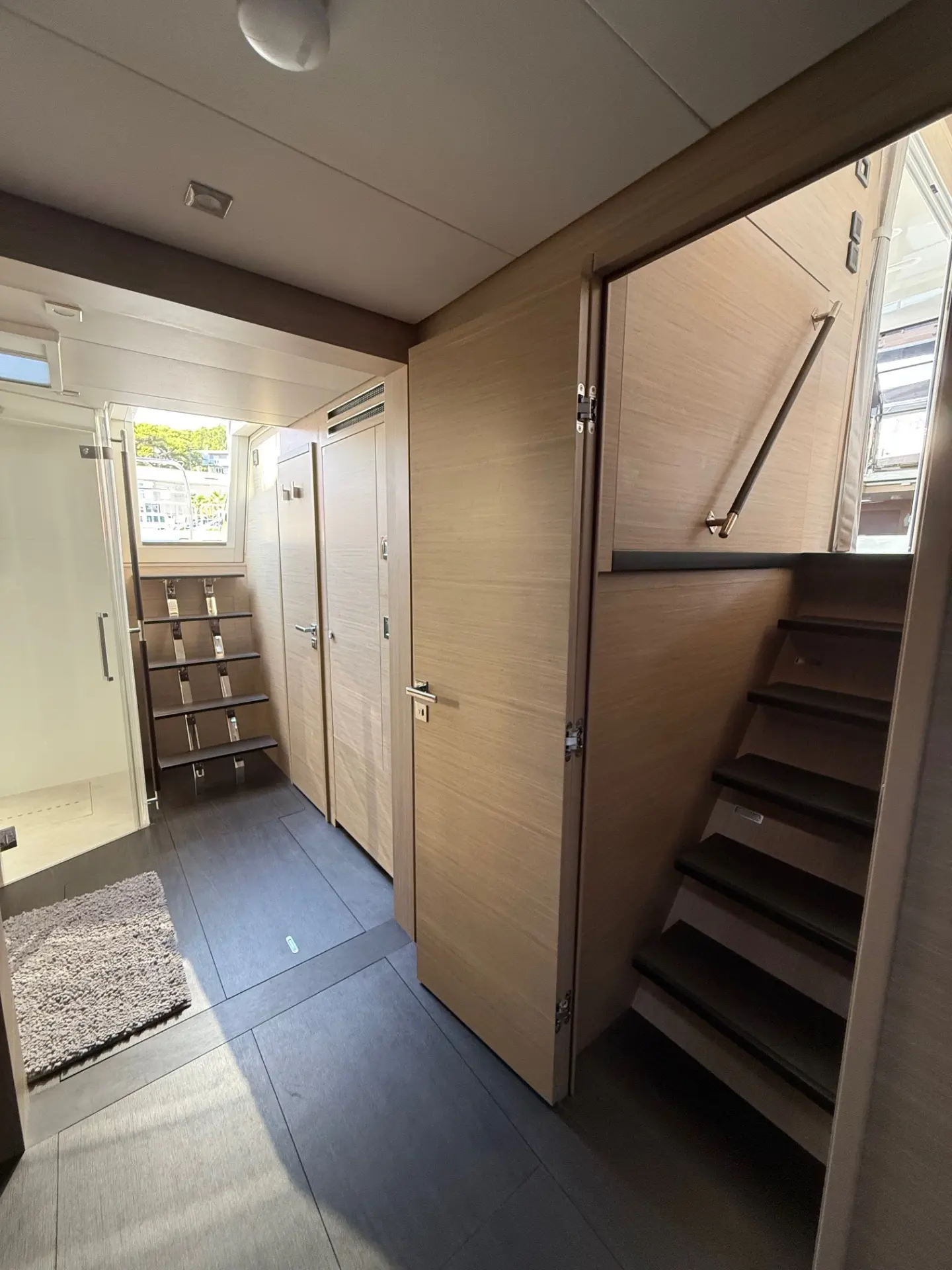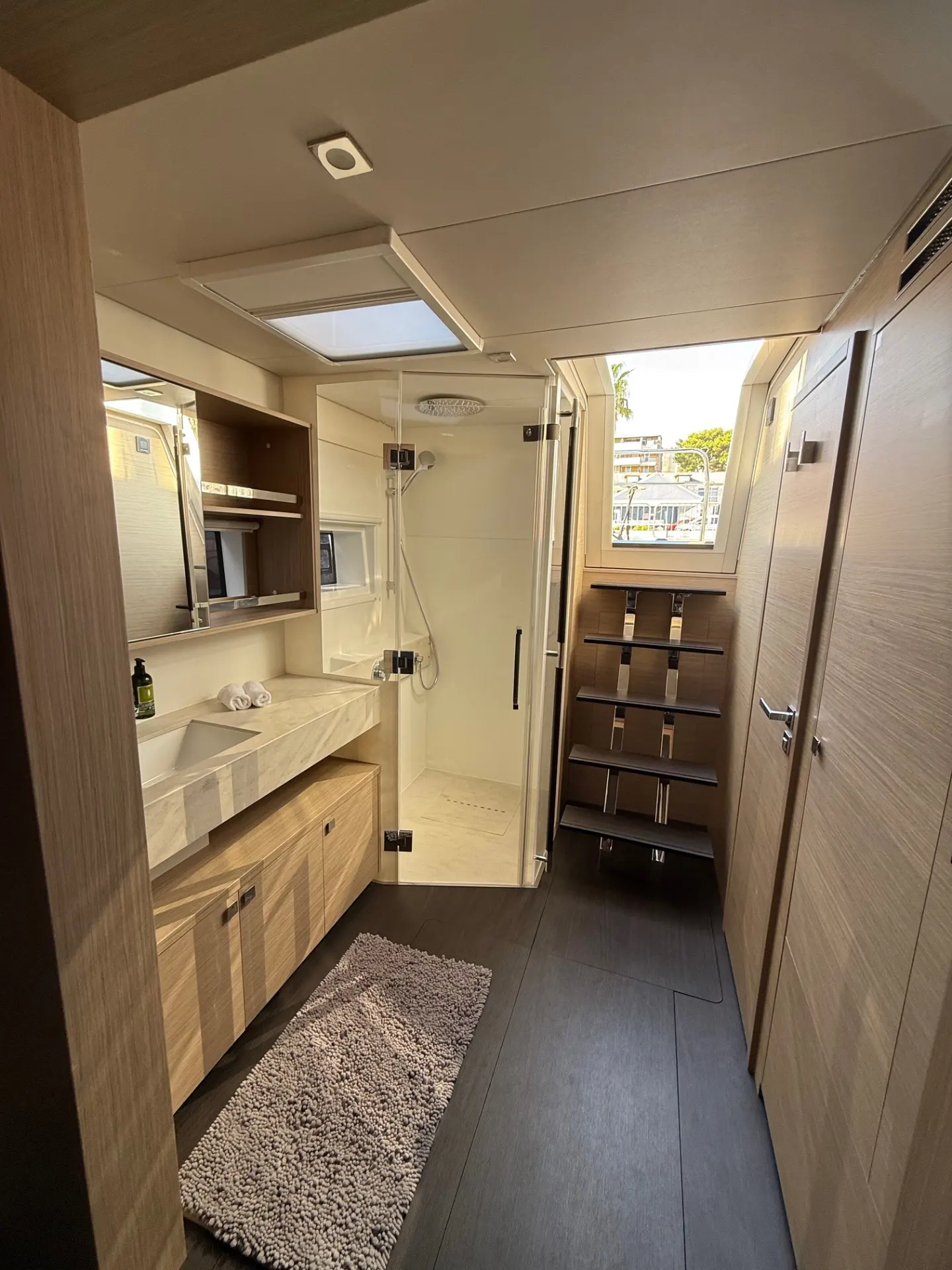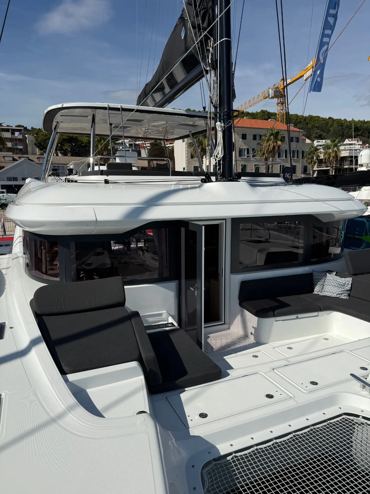 - Außenbereiche: Genießen Sie das Leben im Freien auf dem riesigen Achterdeck, ideal für Mahlzeiten im Schatten, oder entspannen Sie auf dem weitläufigen Vorschiff und den Trampolinen, die zum Sonnenbaden einladen. Die Flybridge bietet zusätzliche Aussichtsplattformen und einen zweiten Steuerstand.