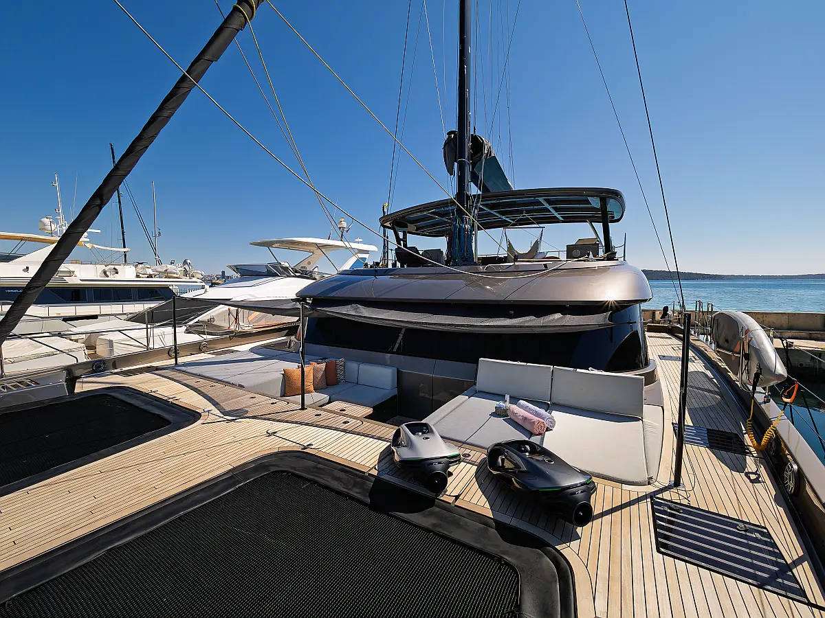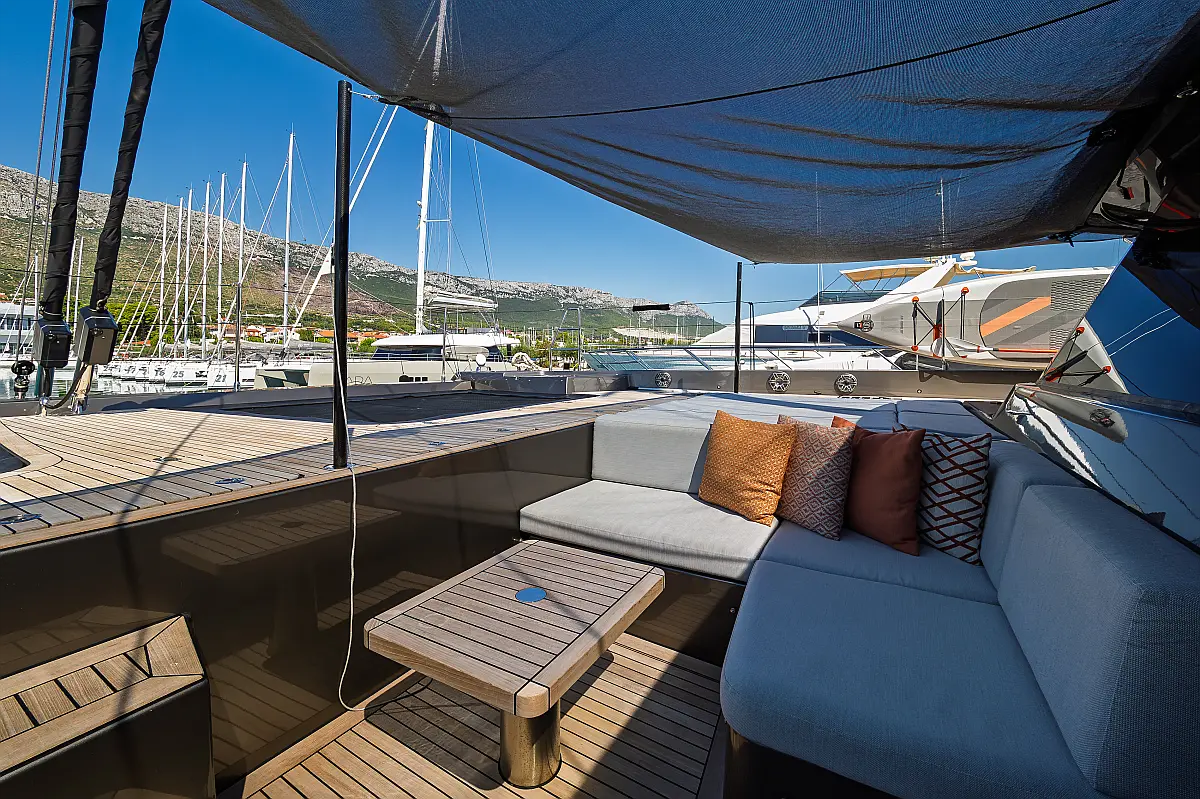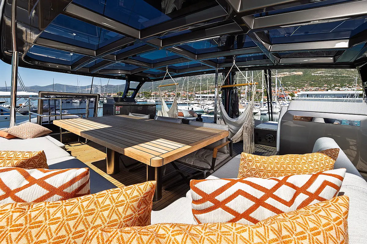 - Spektakuläre Außenbereiche: Genießen Sie das Leben im Freien auf dem weitläufigen Achterdeck, das sich perfekt für gesellige Mahlzeiten oder entspannte Stunden am Wasser eignet. Die großzügige Flybridge ist ein weiteres Highlight und bietet zusätzlichen Platz zum Sonnenbaden, Entspannen und Genießen des Panoramablicks über die azurblaue Adria.
