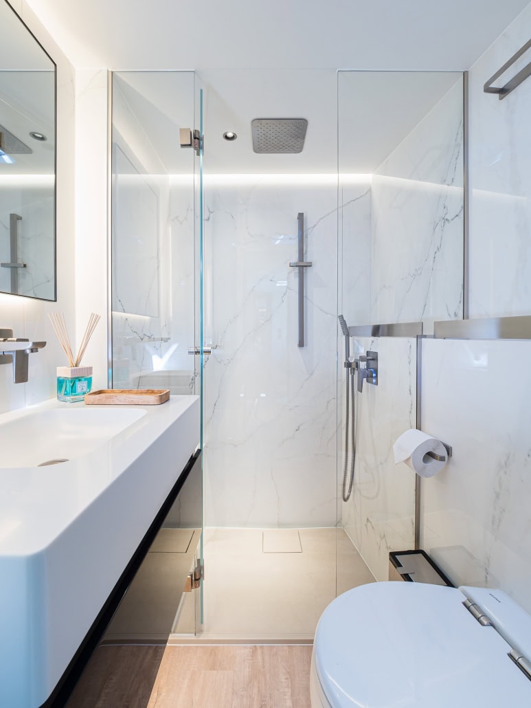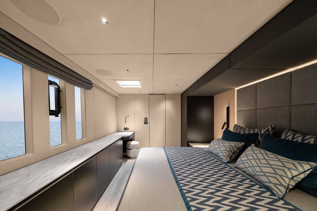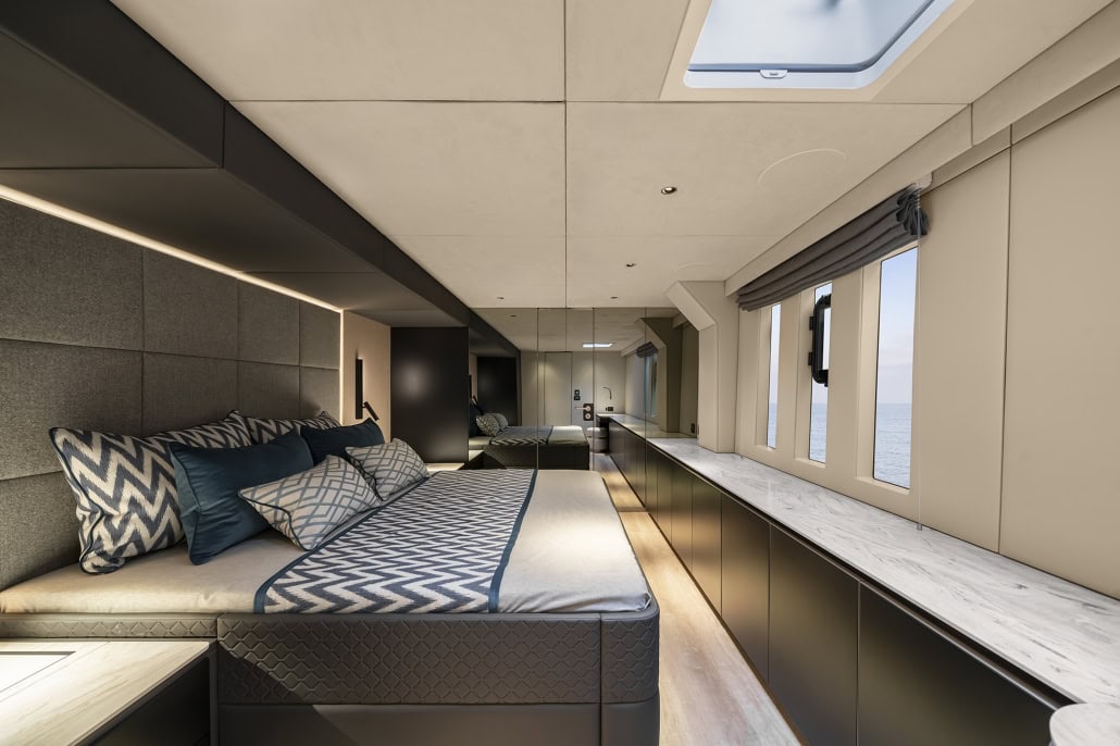 - Großzügige Wohnräume: Die exklusive Yacht bietet Platz für bis zu 10 Gäste in fünf luxuriösen Gästekabinen. Vier davon sind Doppelkabinen, ergänzt durch eine Kabine mit Etagenbetten – alle mit eigenem, stilvollen Badezimmer. Die Gestaltung des offenen Salons auf dem Hauptdeck, der nahtlos in das Achtercockpit übergeht, schafft einen weitläufigen, halboffenen Ess- und Sonnenbereich. Oberlicht, Panoramaverglasung und eine breite Schiebetür lassen die Sonne ungehindert in den individuell gestalteten Innenraum fluten und verschmelzen Wohnraum und Aussicht zu einem harmonischen Ganzen.