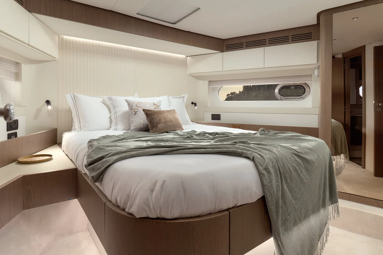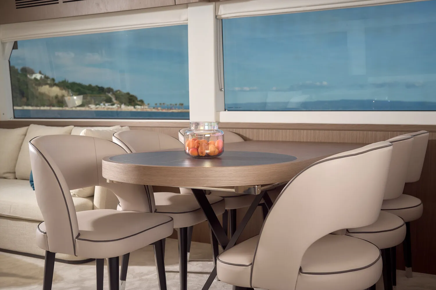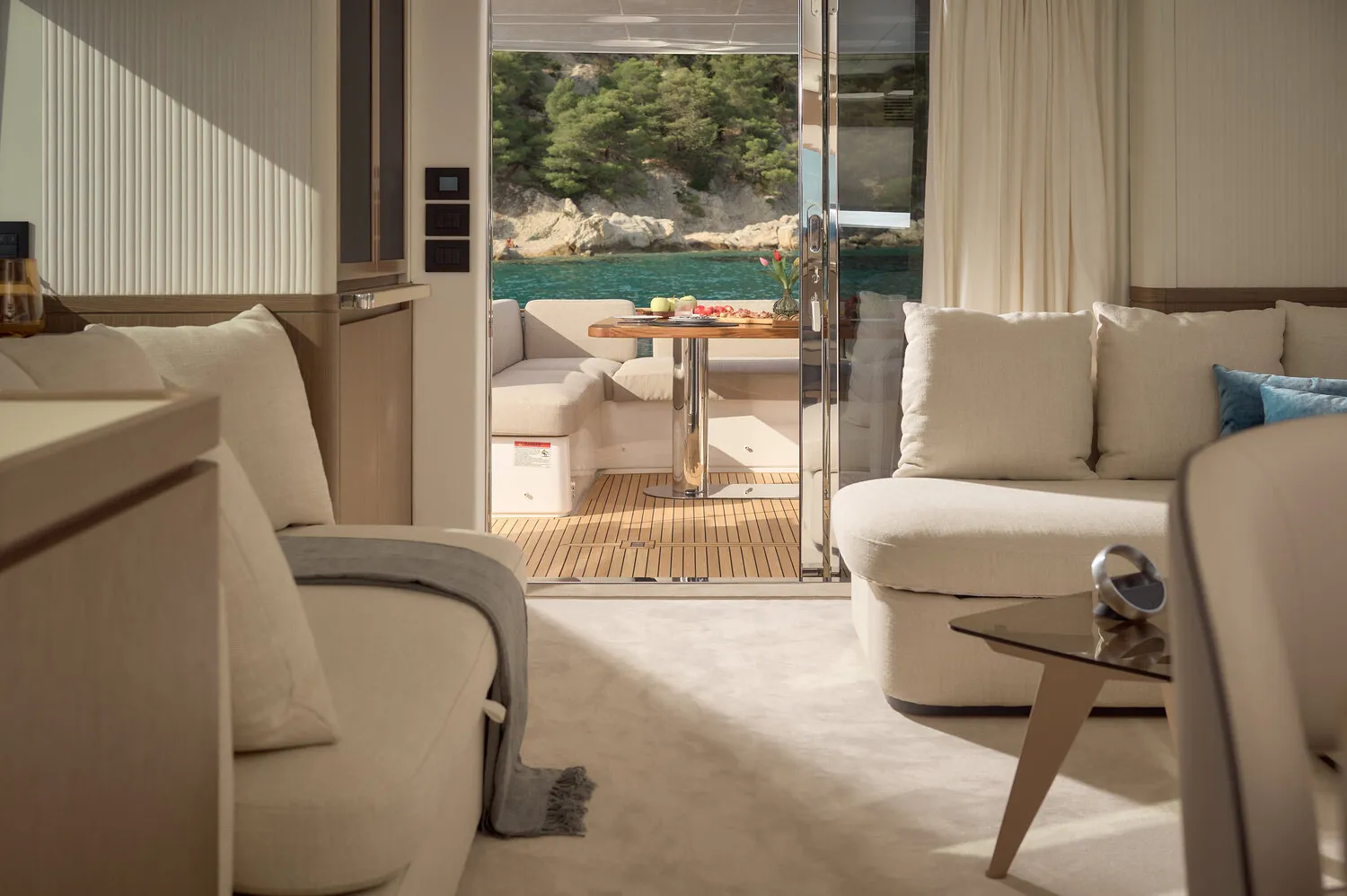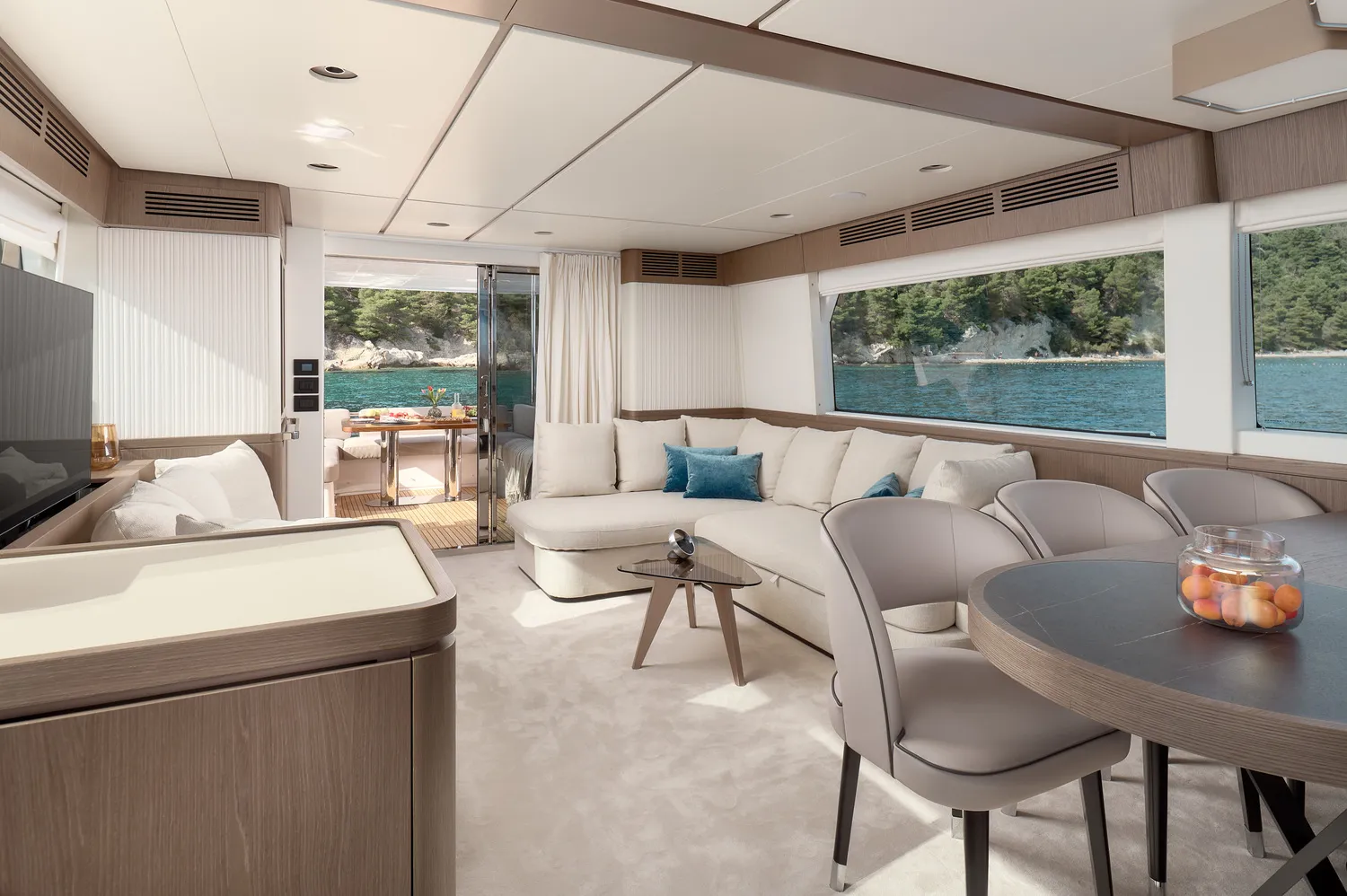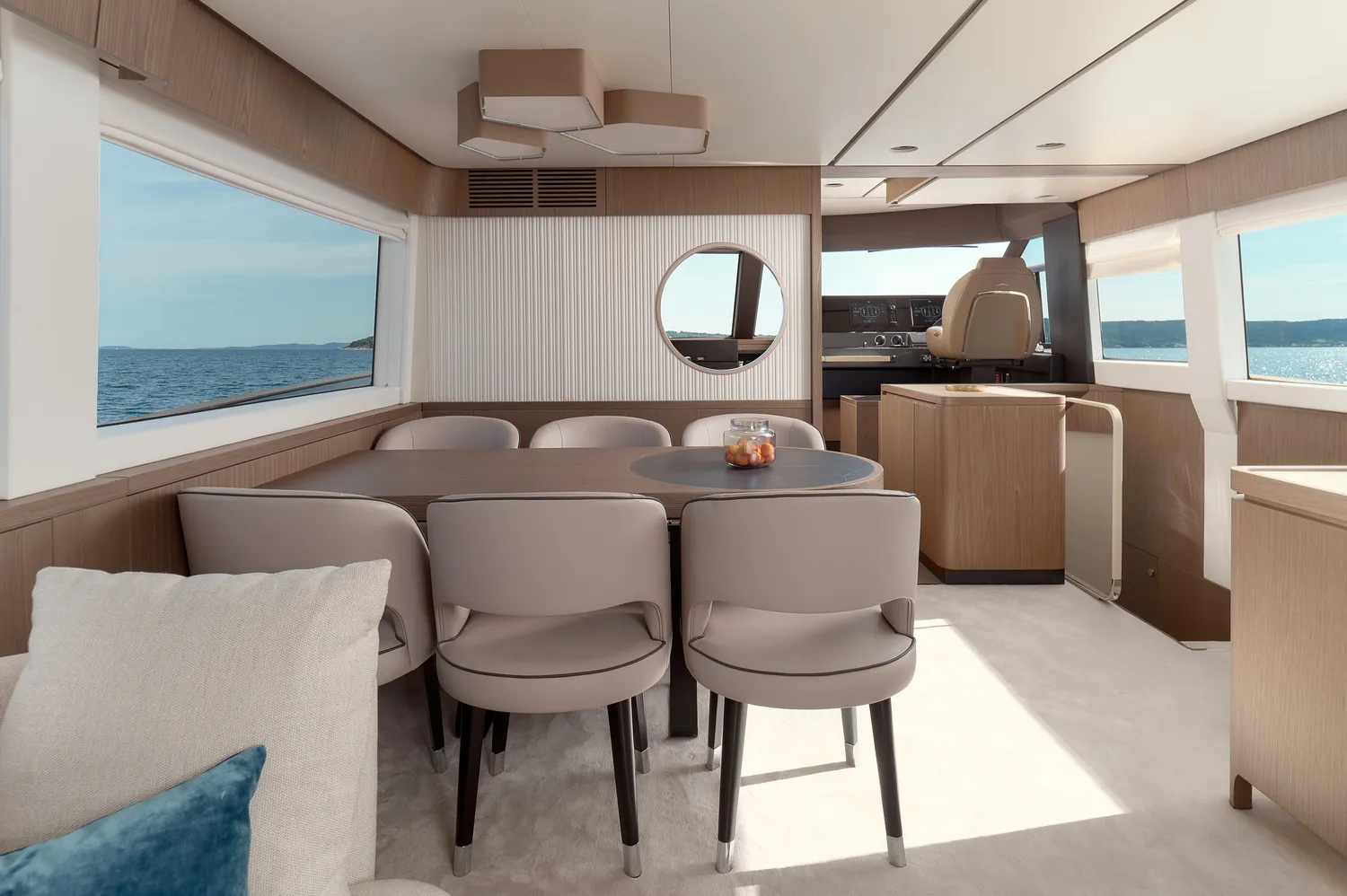 - Navetta-Design: Das Hauptdeck spiegelt die Navetta-Philosophie wider und ist lichtdurchflutet. Die großen Fensterflächen im Salon vermitteln ein Gefühl grenzenloser Freiheit und Eleganz, ein Kontrast zu den kompaktern Sport-Flybridge-Modellen.