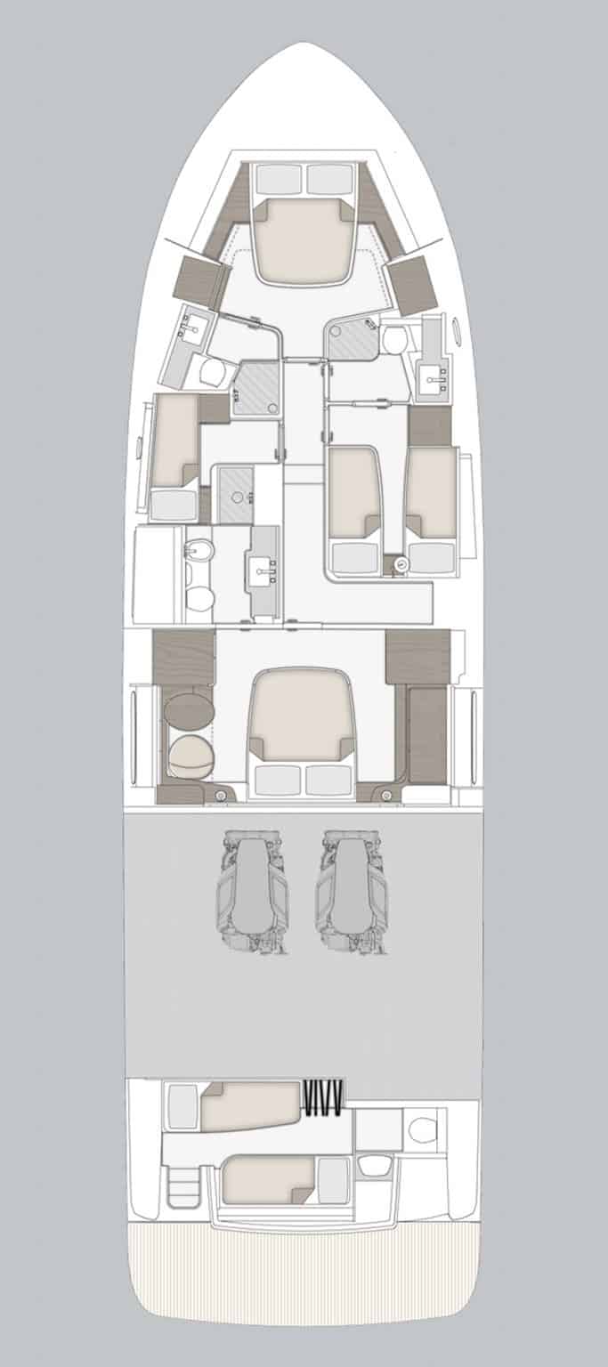 - Außenbereiche: Die spektakuläre Flybridge lädt zum Verweilen ein, während das vielseitige Cockpit mühelos vom eleganten Essbereich zum ruhigen Rückzugsort unter freiem Himmel wird.