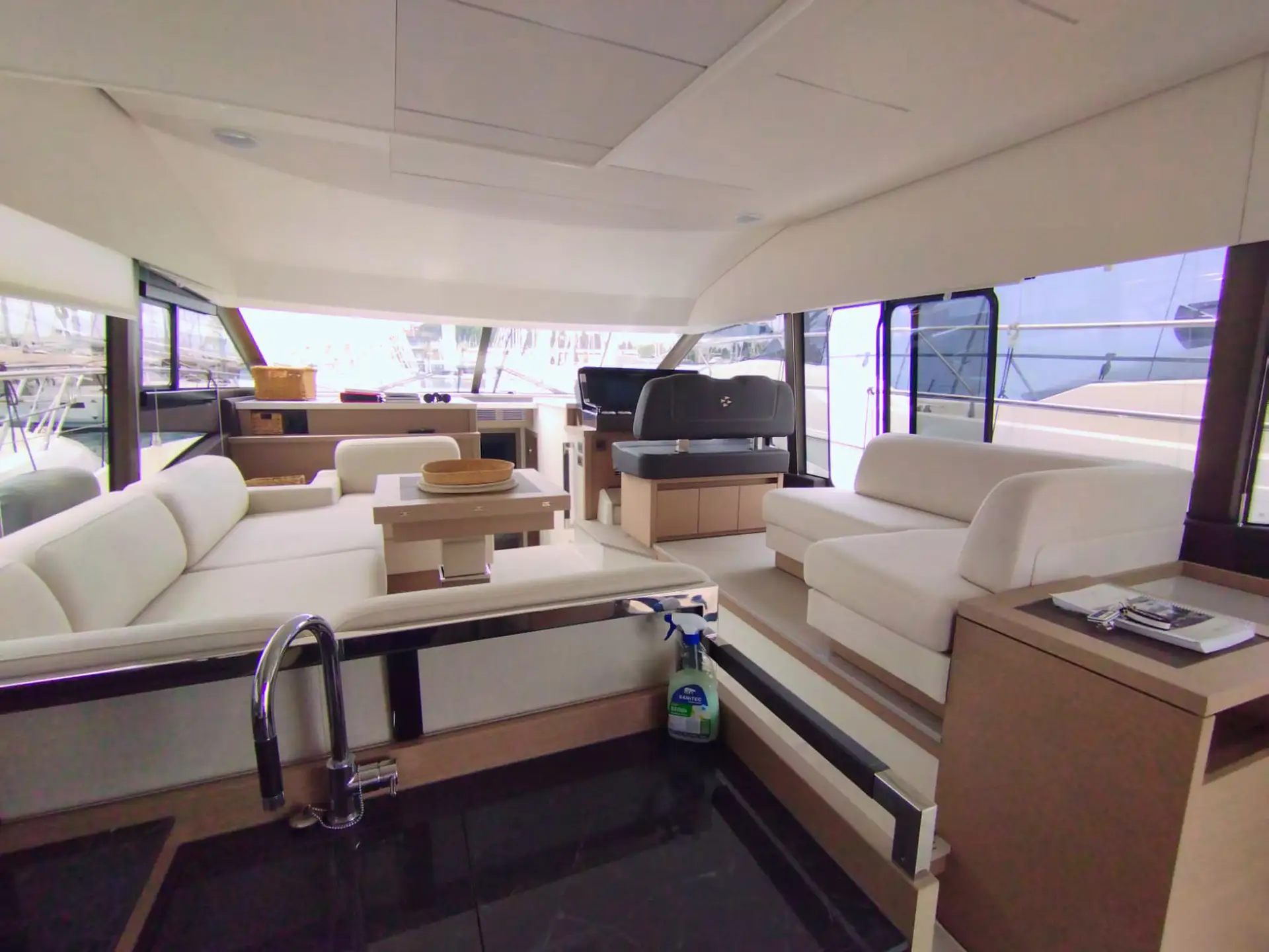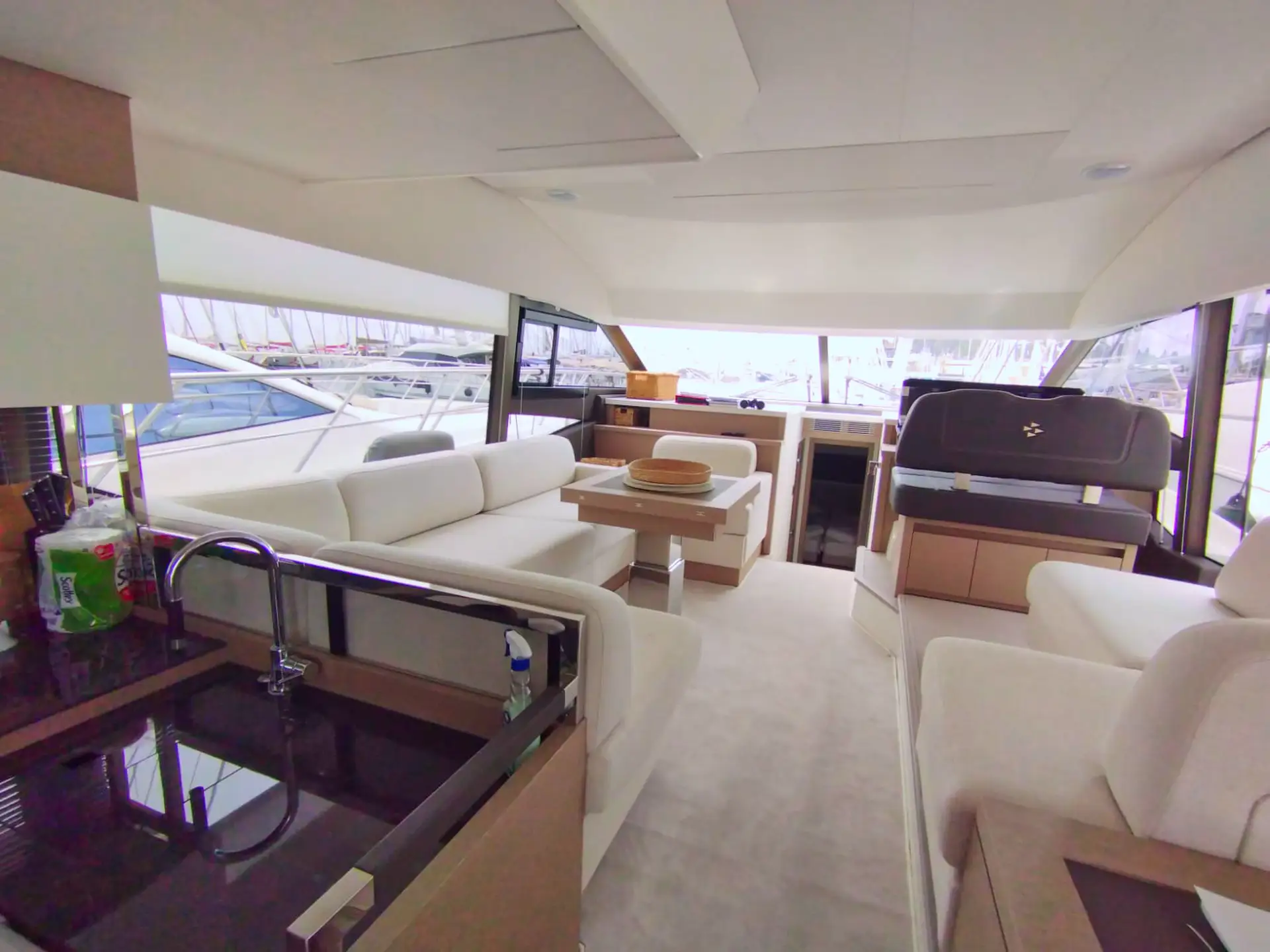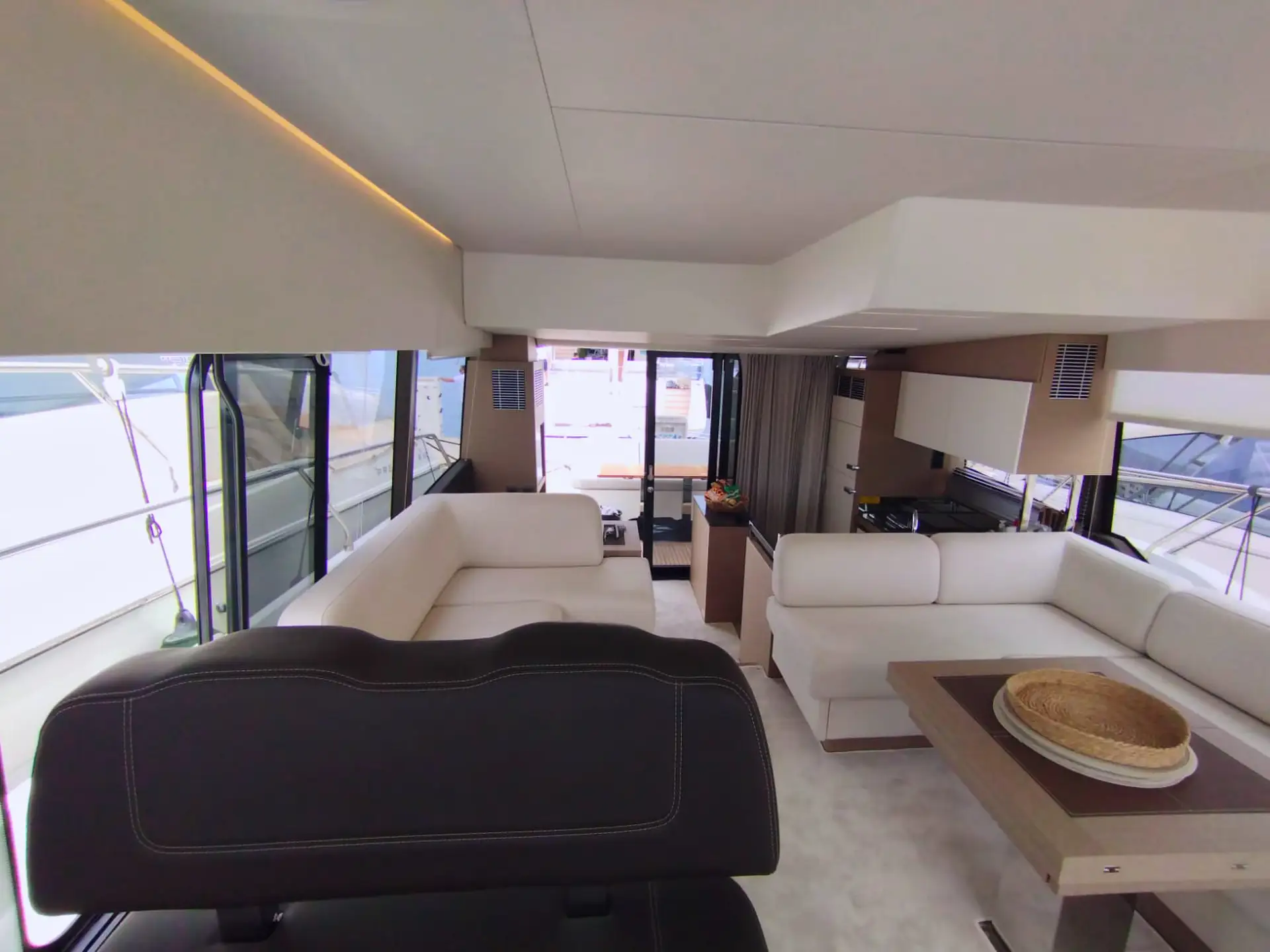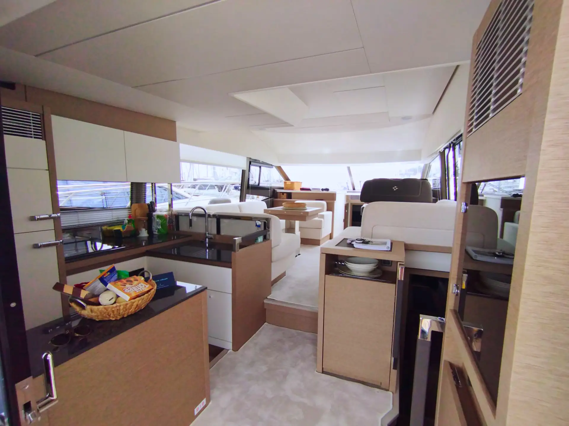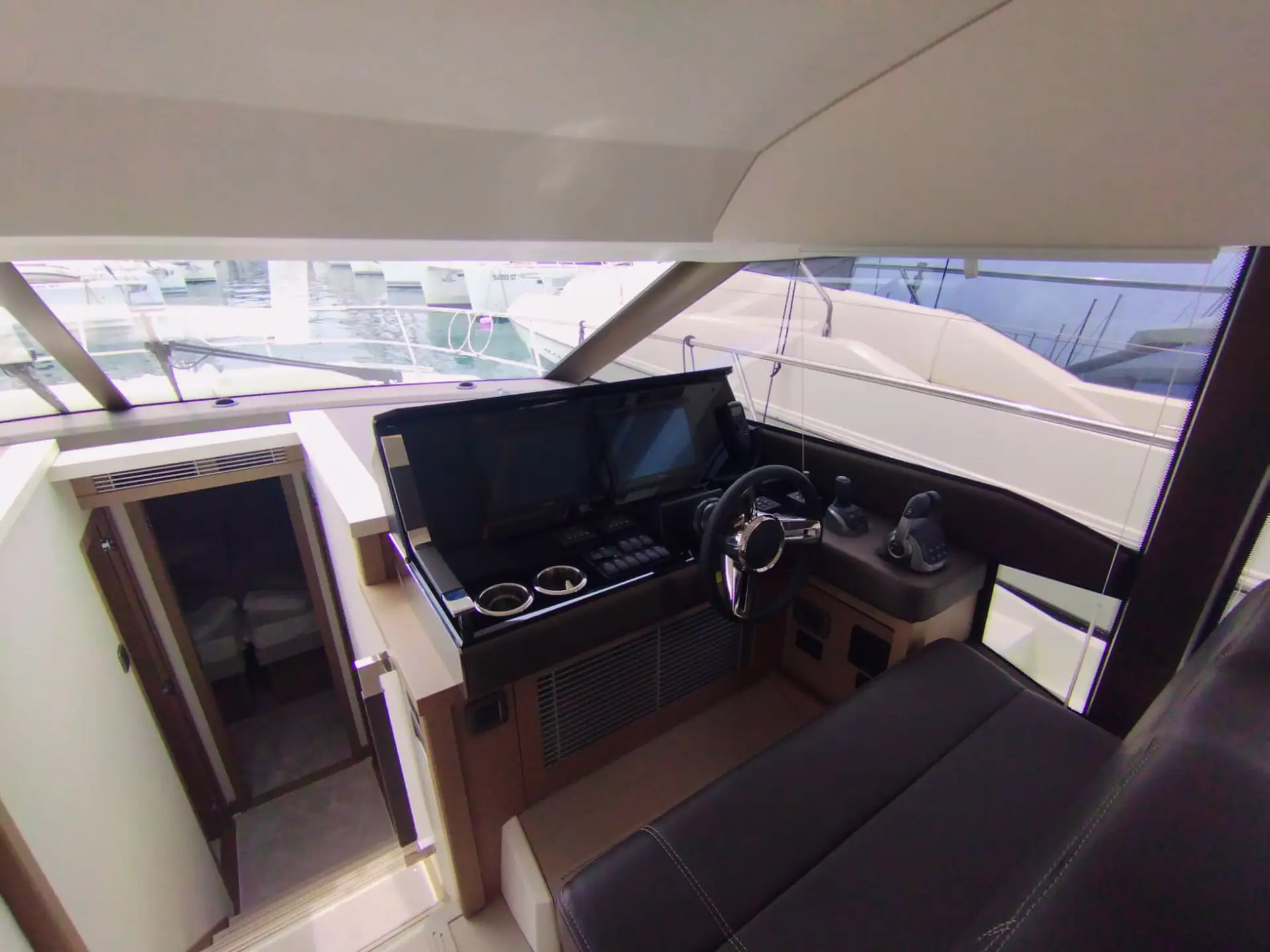 • Die Flybridge: Das Highlight ist die geräumige Flybridge, die einen zweiten Steuerstand, eine Sonnenliegefläche und eine vollwertige Außen-Pantry bietet – ideal für Sonnenuntergänge mit Champagner.