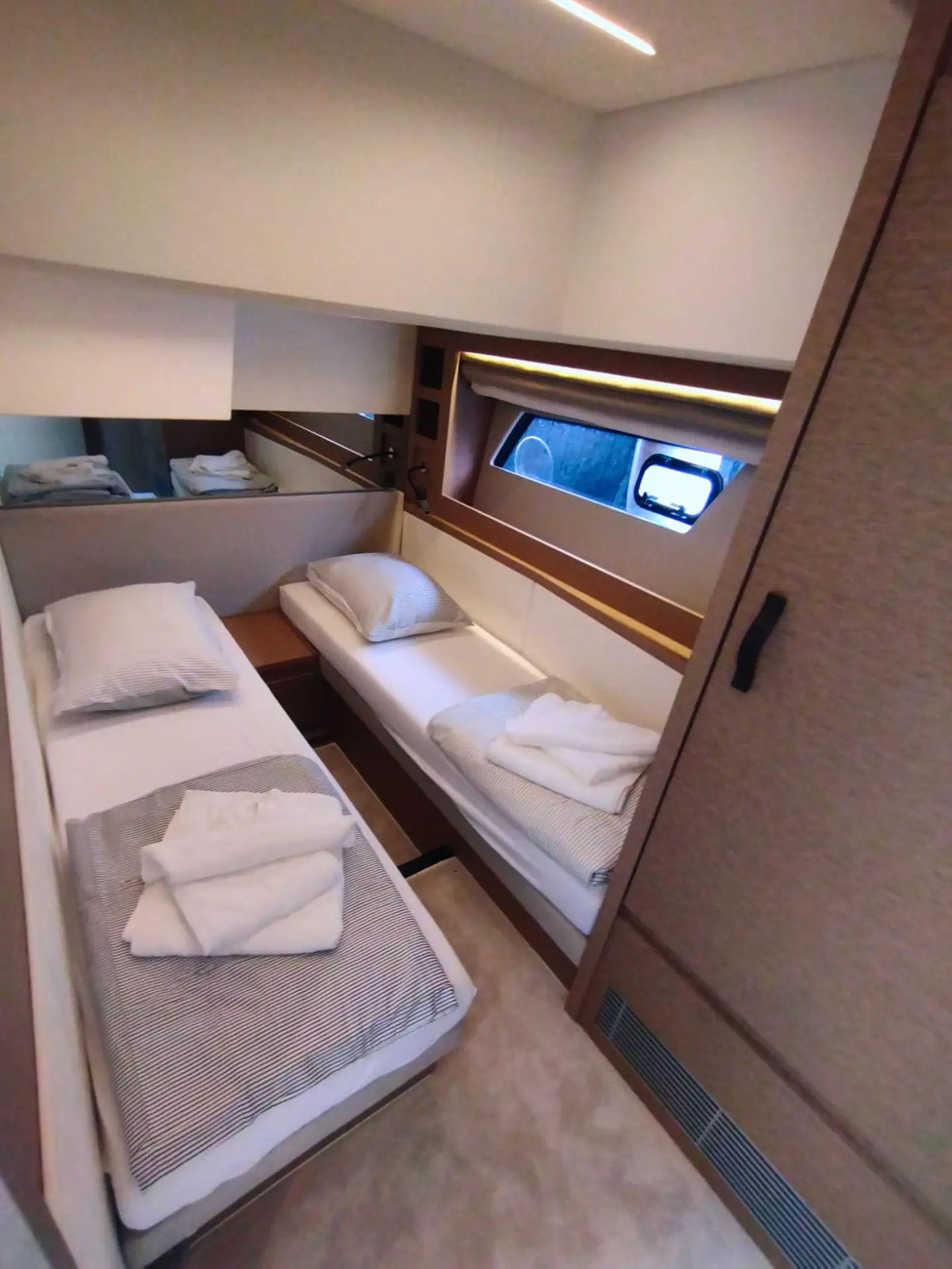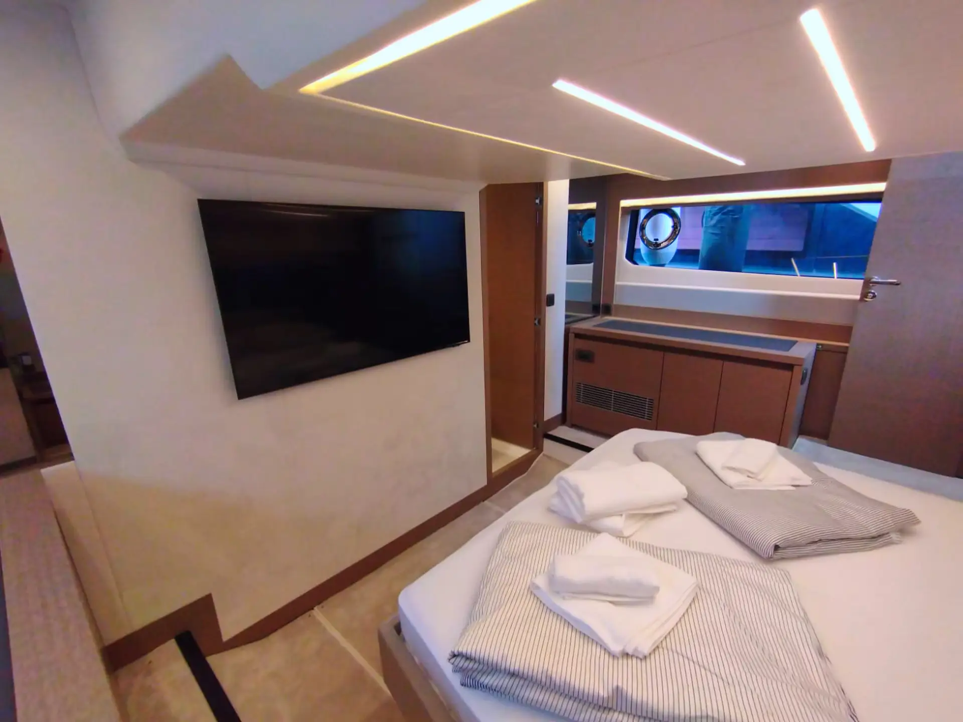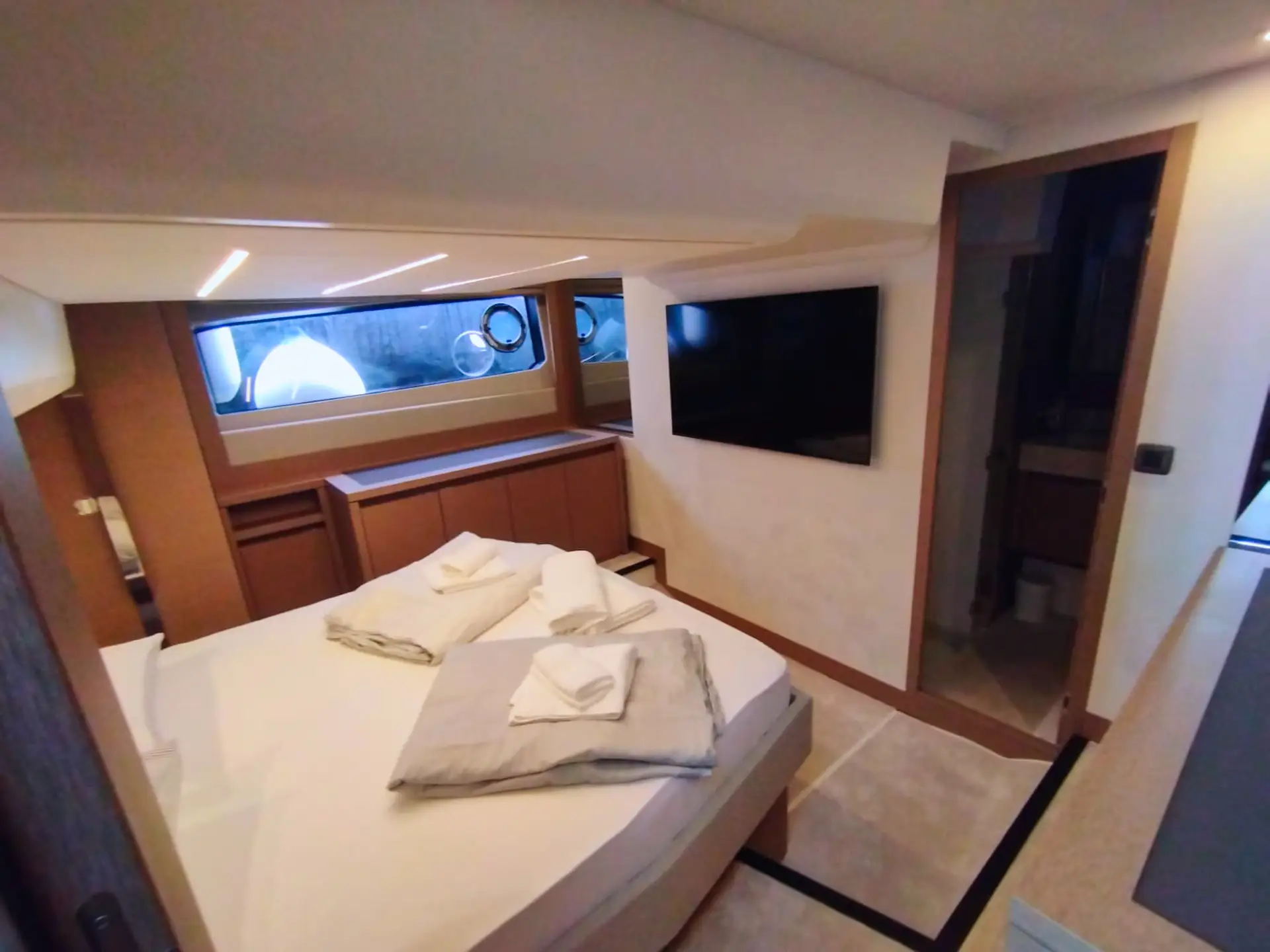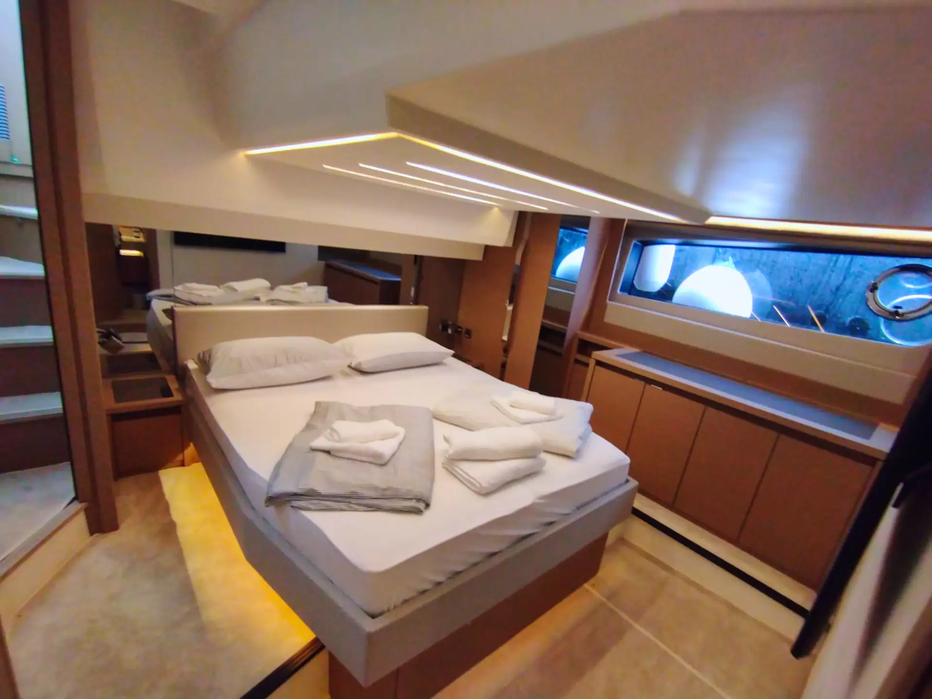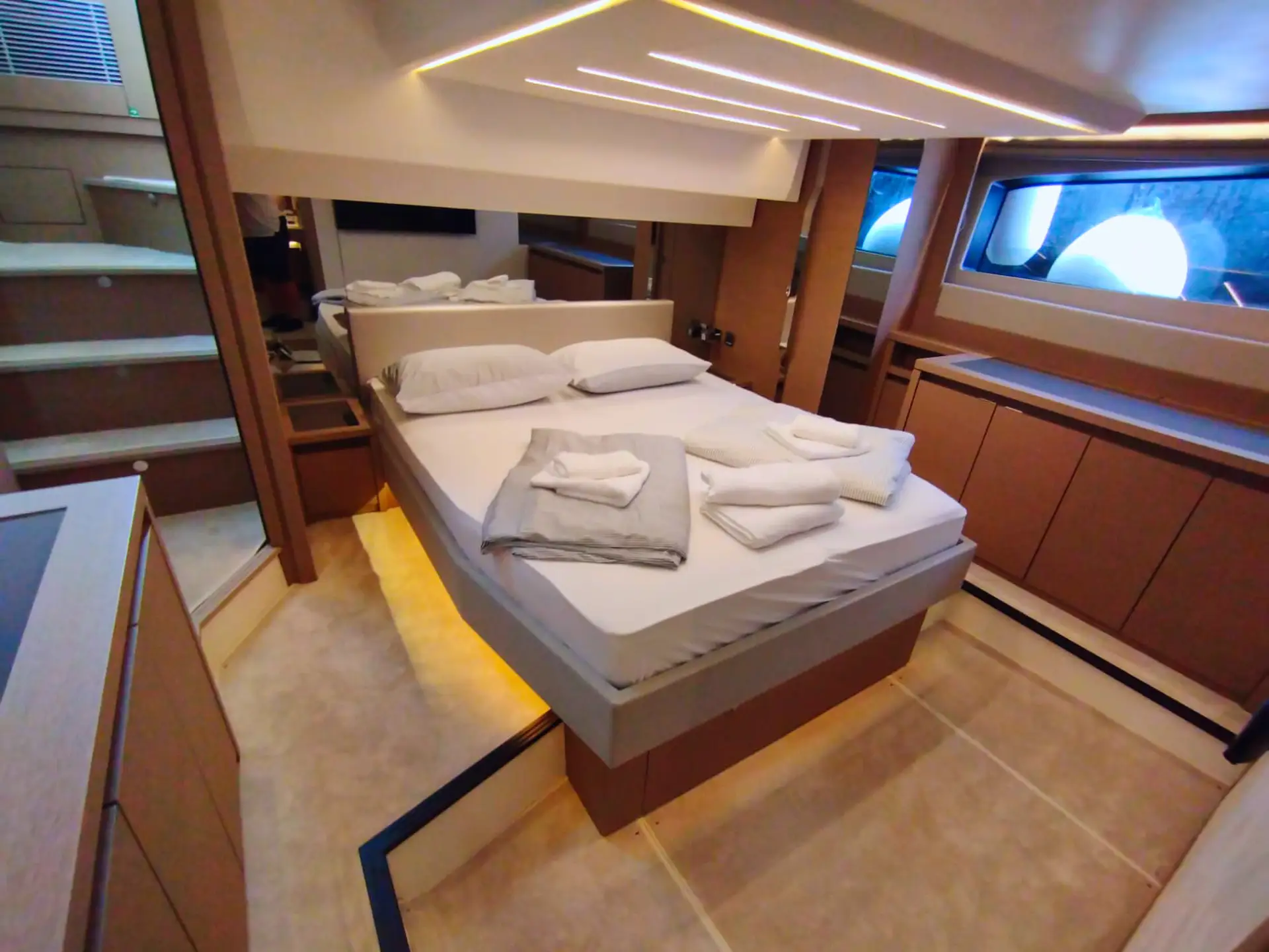 • Die Flybridge: Das Highlight ist die geräumige Flybridge, die einen zweiten Steuerstand, eine Sonnenliegefläche und eine vollwertige Außen-Pantry bietet – ideal für Sonnenuntergänge mit Champagner.